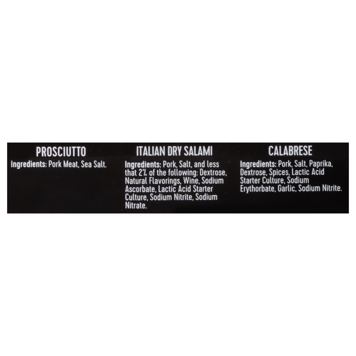 Prosciutto: Pork Meat, Sea Salt. Italian Dry Salami: Pork, Salt, and Less That 2% of the Following: Dextrose, Natural Flavorings, Wine, Sodium Ascorbate, Lactic Acid Starter Culture, Sodium Nitrite, S…