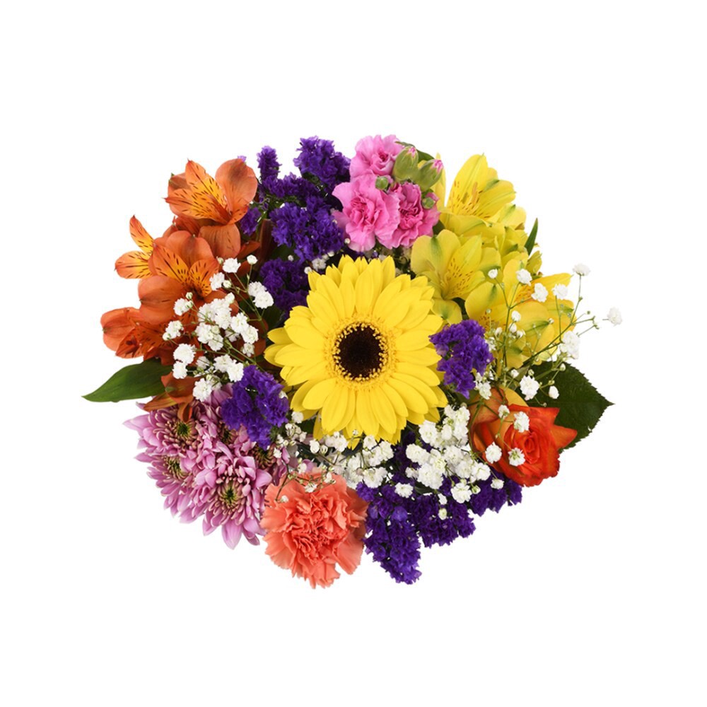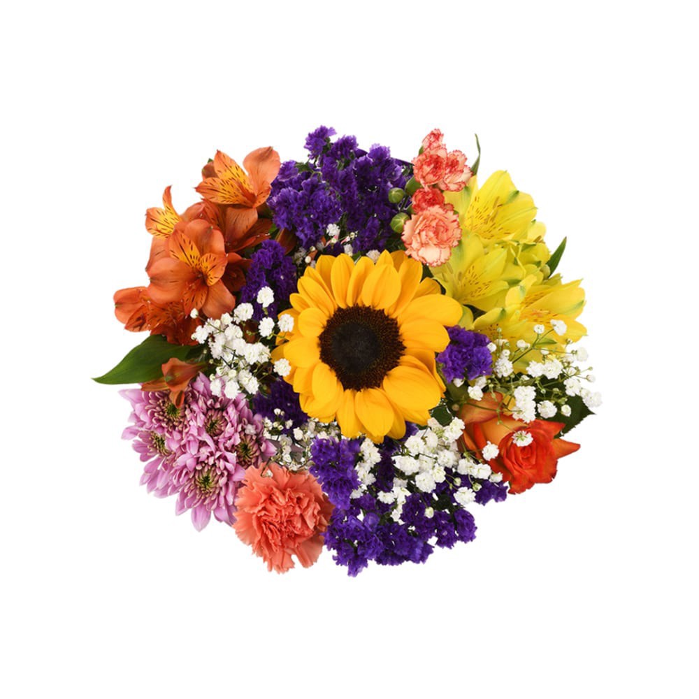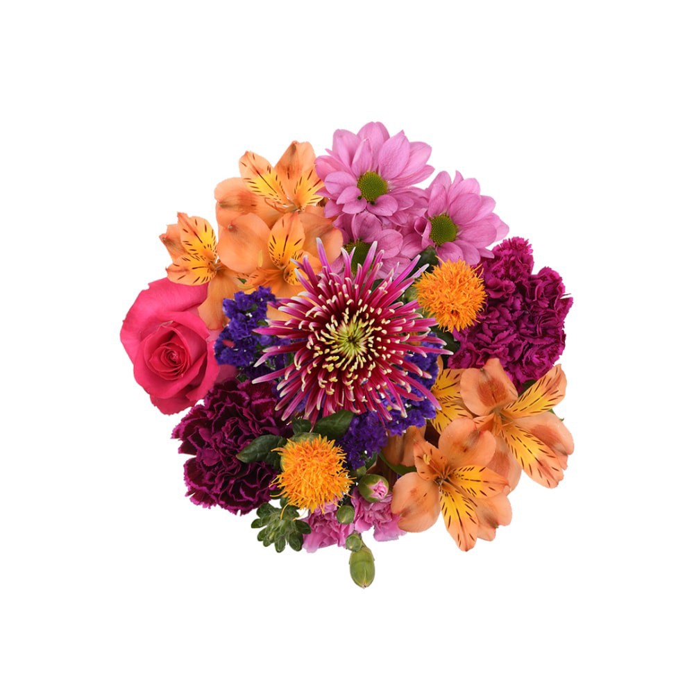 A beautiful floral palette of vibrant orange, yellow, pink & deep purples make this bouquet a unique option for your one-of-a-kind love or friend. Bouquet arrives decoratively sleeved, ready for the r…