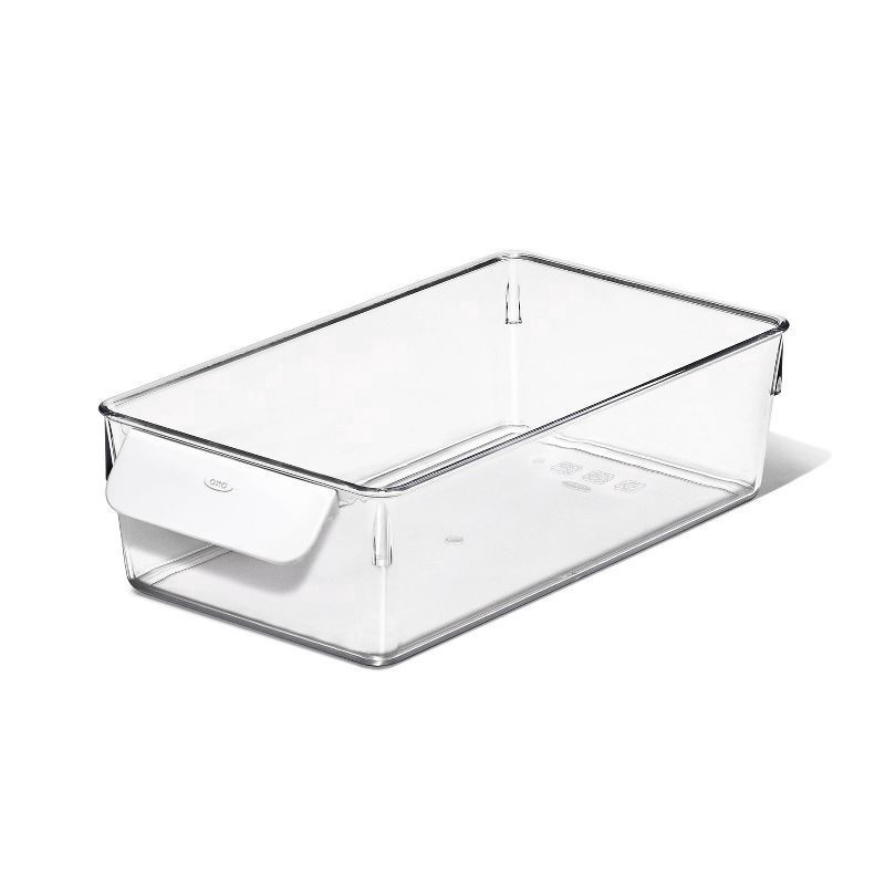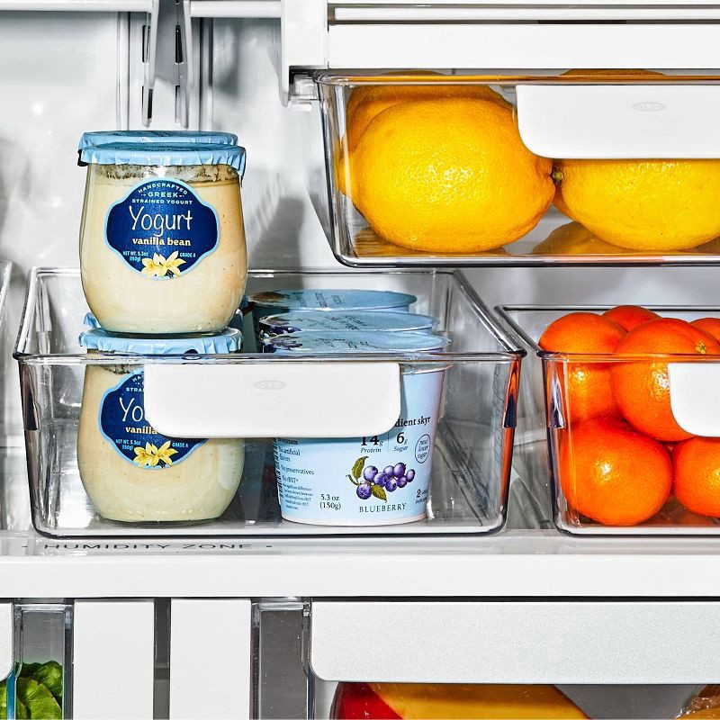 Organize the contents of your fridge to cut down on clutter and prevent food waster. The OXO Fridge-Focused Organization System features a combination of bins, drawers, shelves, and risers, to help st…