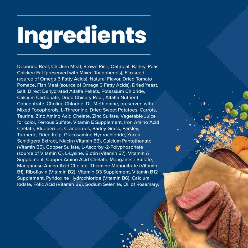 Deboned Beef, Chicken Meal, Brown Rice, Oatmeal, Barley, Peas, Chicken Fat (Preserved with Mixed Tocopherols), Flaxseed (Source Omega 6 Fatty Acids), Natural Flavor, Dried Tomato Pomace, Fish Meal (So…