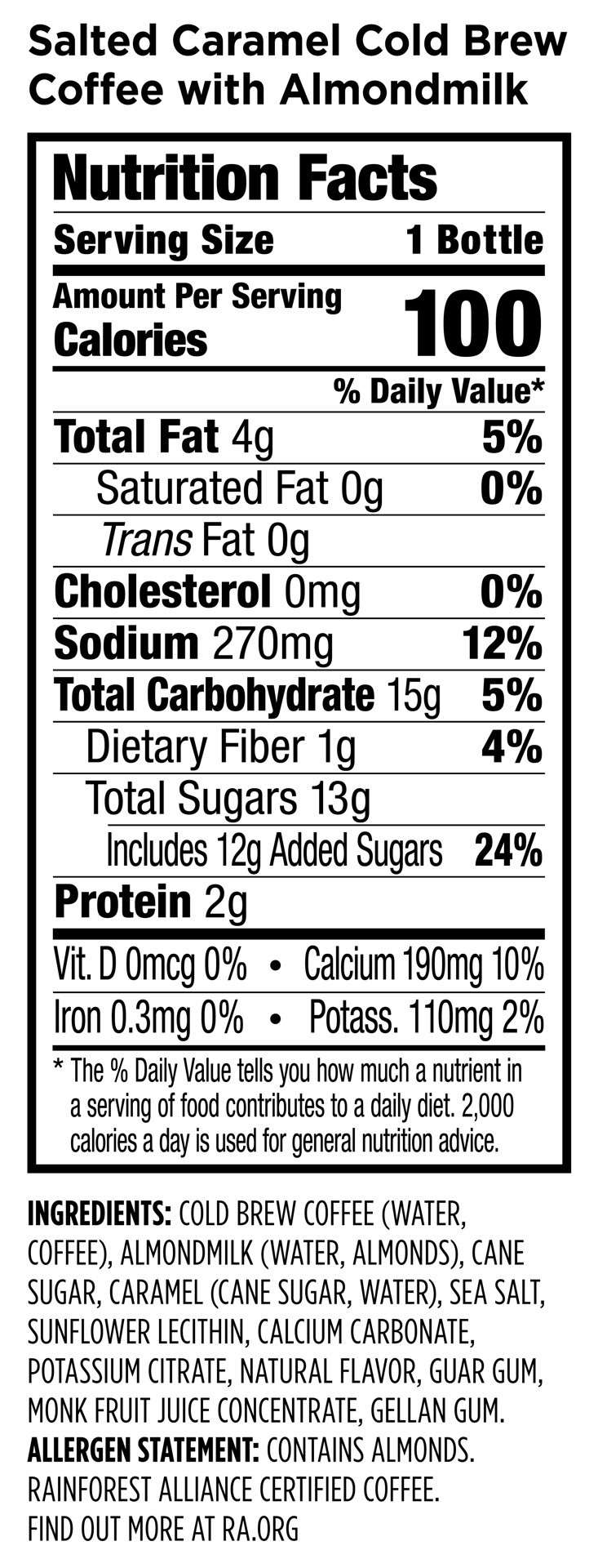 Cold Brew Coffee (Water, Coffee), Almondmilk (Water, Almonds), Cane Sugar, Caramel (Cane Sugar, Water), Sea Salt, Sunflower Lecithin, Calcium Carbonate, Potassium Citrate, Natural Flavor, Locust Bean …