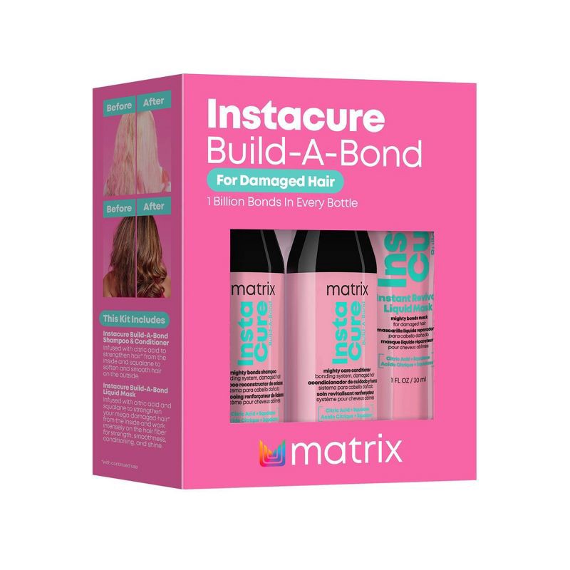 The Matrix Instacure Build-A-Bond Trial Kit repairs and strengthens damaged hair, featuring a shampoo, conditioner, and mask. This powerhouse trio is enriched with citric acid to reinforce hair streng…