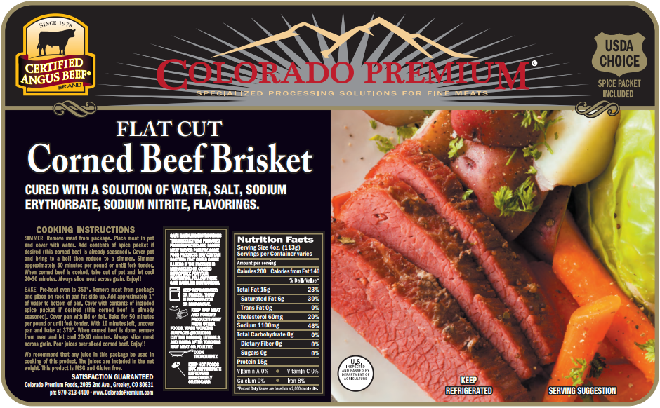 Market district Colorado premium flat cut corned beef brisket cured with a solution of water, salt, sodium, erythorbate, sodium nitrate and flavorings. Certified Augus beef UDSA choice.