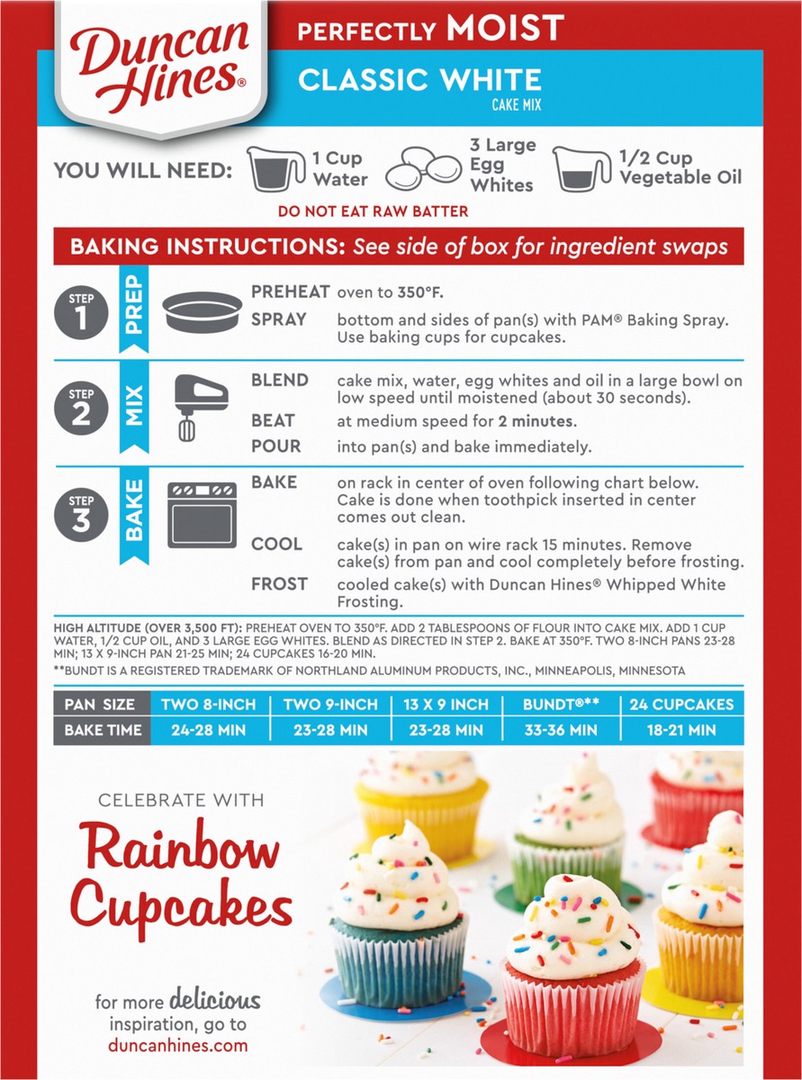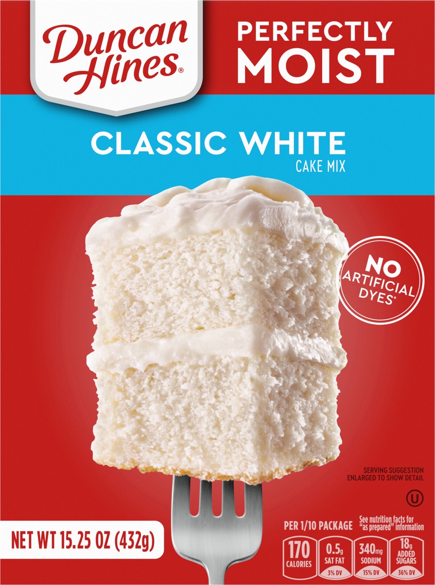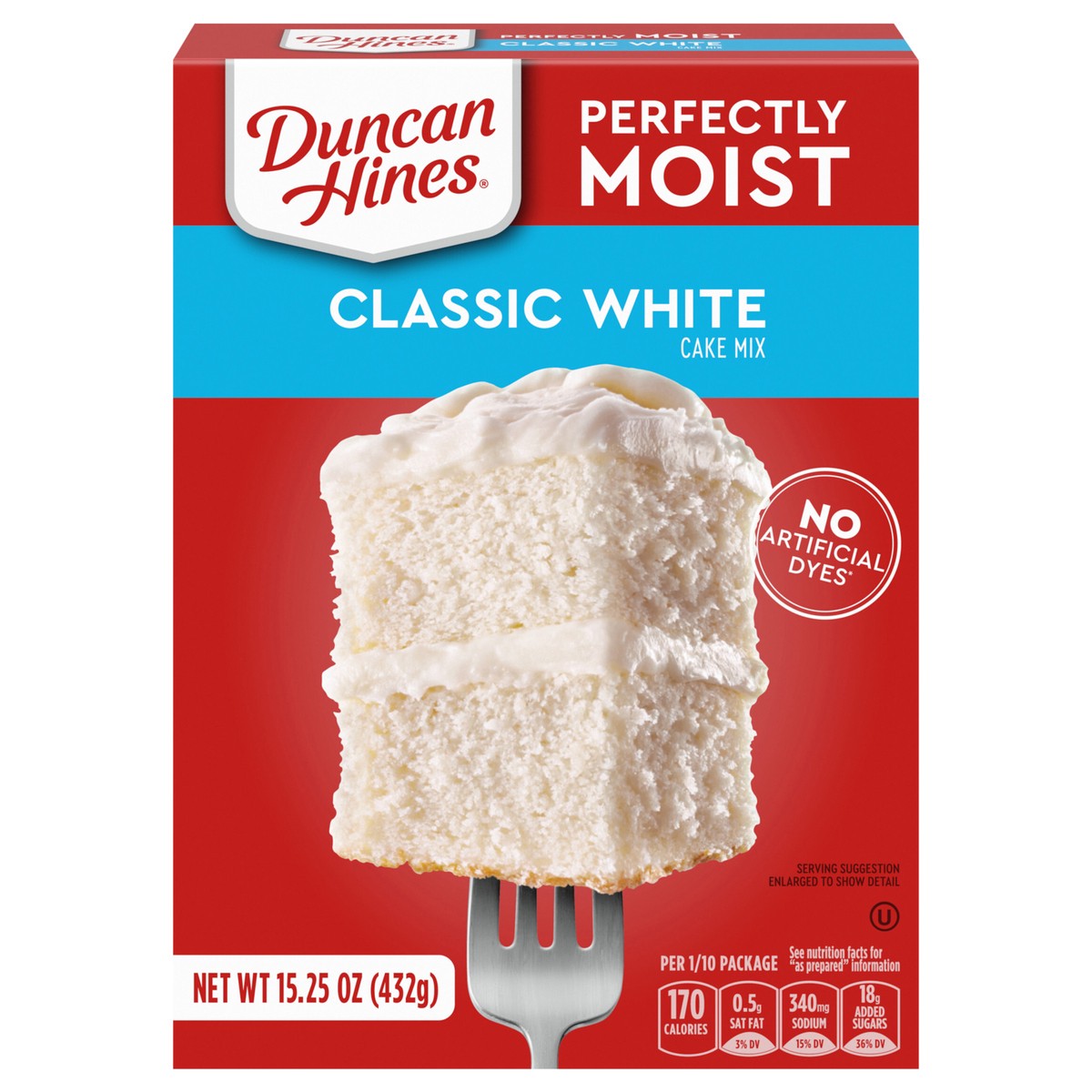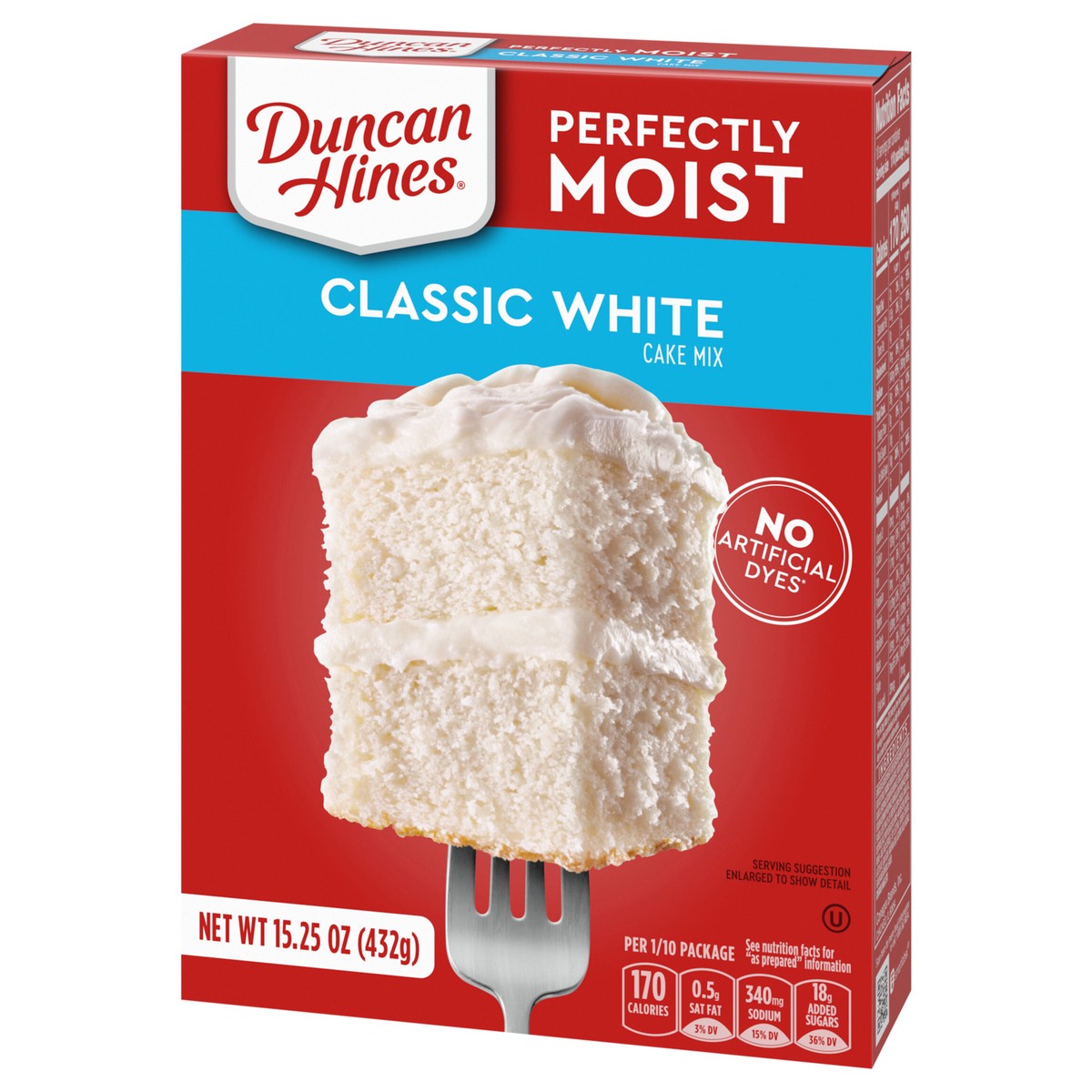 - What You Get: One 15.25-oz. box of Duncan Hines Perfectly Moist Classic White Cake Mix