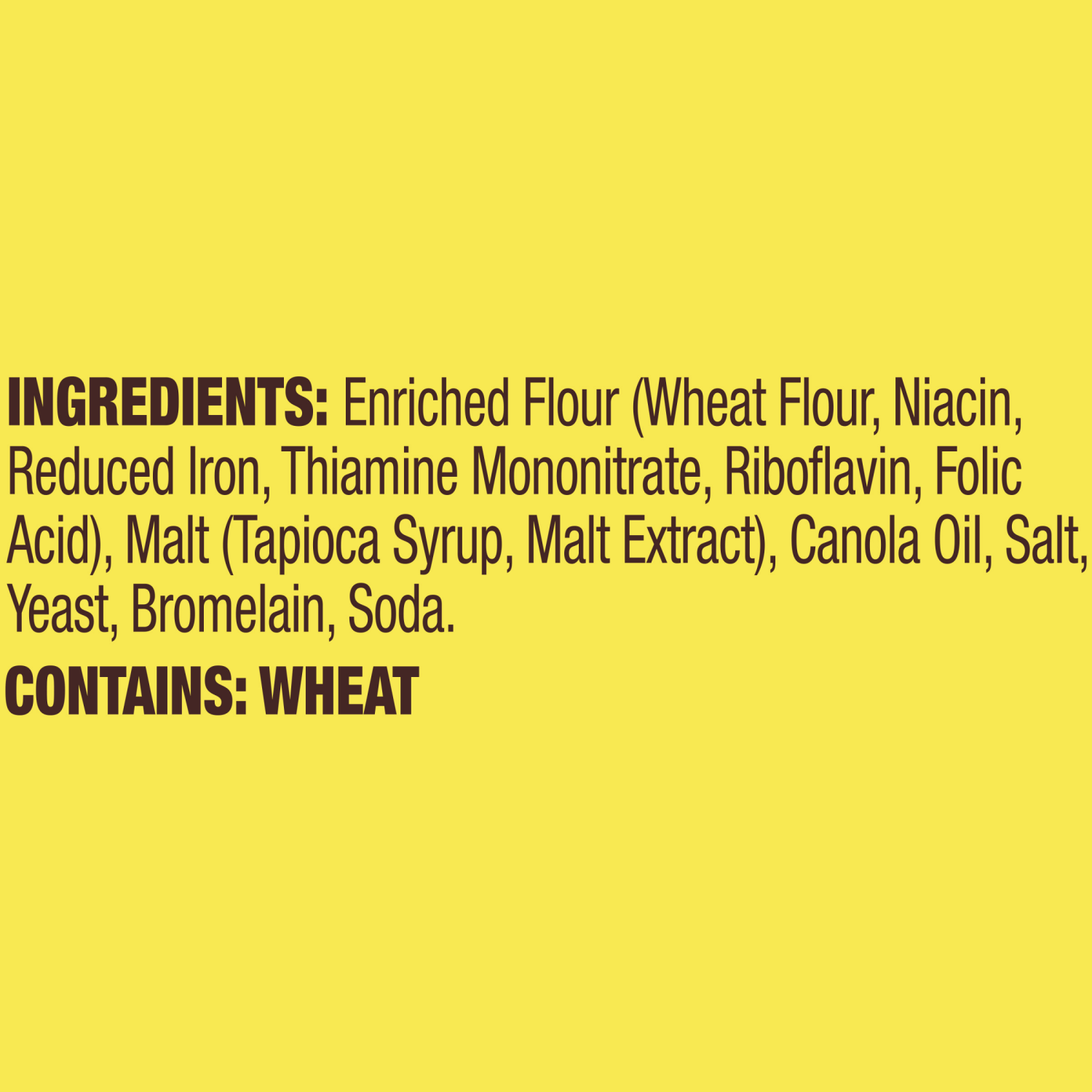 INGREDIENTS: Enriched Flour (Wheat Flour, Niacin, Reduced Iron, Thiamine Mononitrate, Riboflavin, Folic Acid), Malt (Tapioca Syrup, Malt Extract), Canola Oil, Salt, Yeast, Bromelain, Soda. *Adds a tri…
