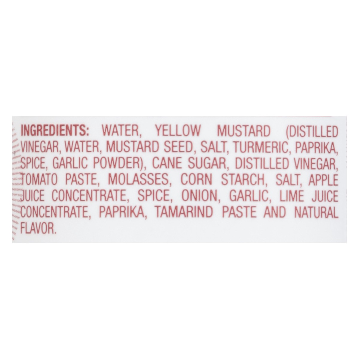 Water, Yellow Mustard (Distilled Vinegar, Water, Mustard Seed, Salt, Turmeric, Paprika, Spice, Garlic Powder), Cane Sugar, Distilled Vinegar, Tomato Paste, Molasses, Corn Starch, Salt, Apple Juice Con…