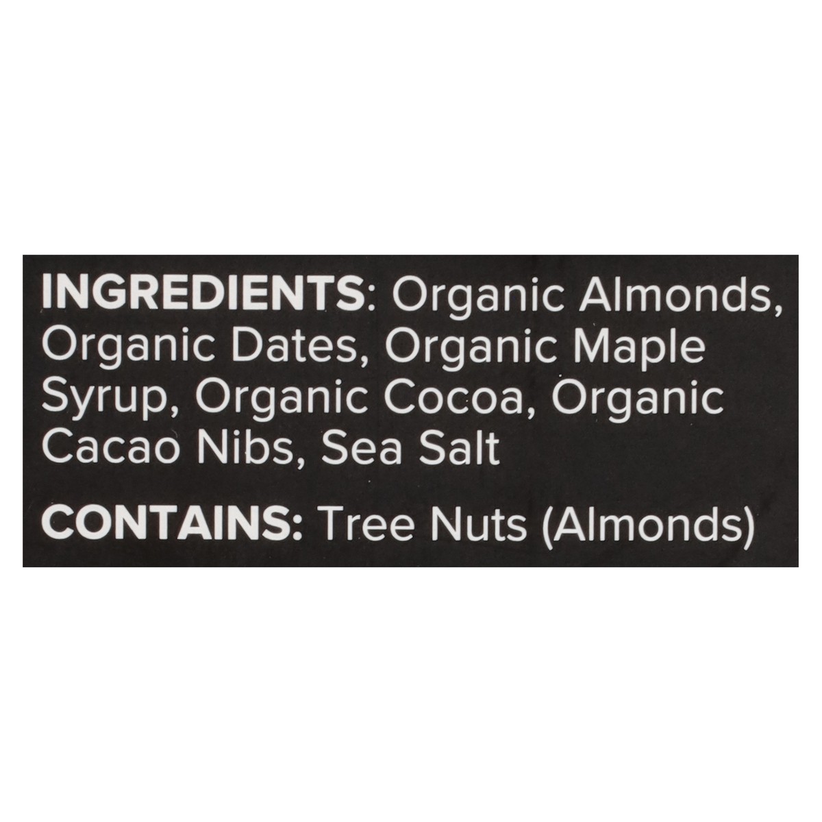 Organic Almonds, Organic Dates, Organic Maple Syrup, Organic Cocoa, Organic Cacao Nibs, Sea Salt.