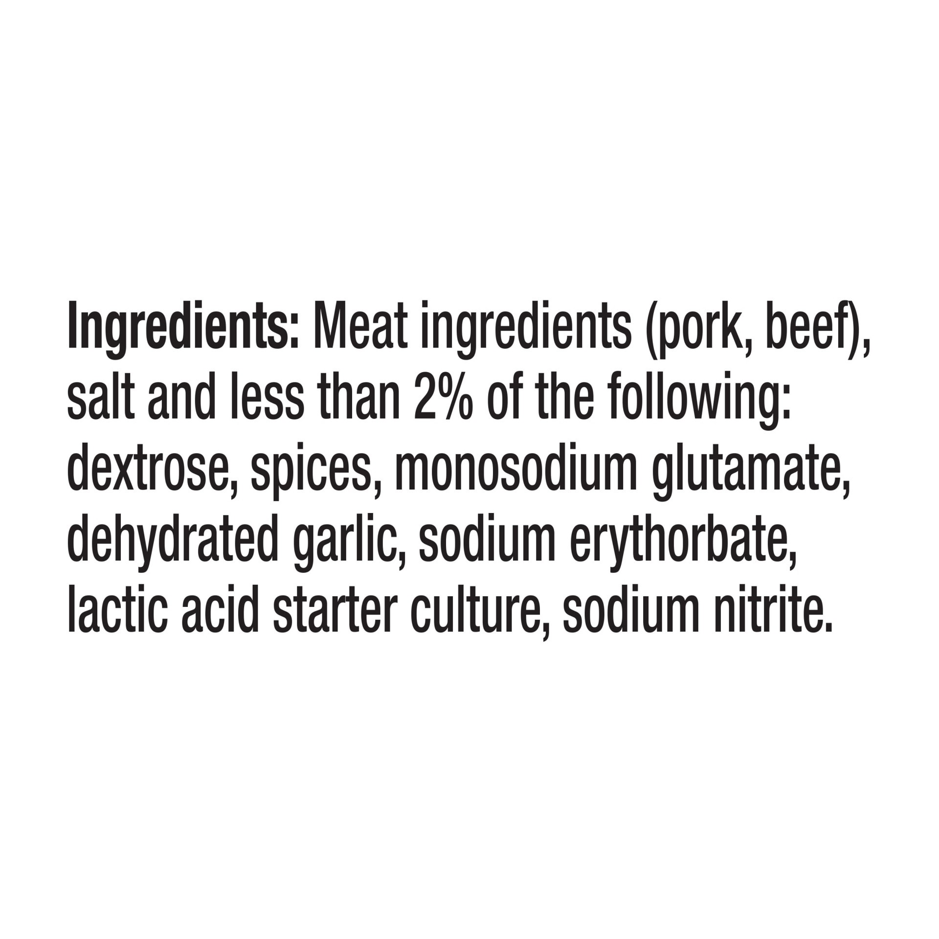 Ingredients: Beef and Pork, salt, dextrose, natural spices, monosodium glutamate, sodium erythorbate, lactic acid starter culture, natural flavoring, sodium nitrite.
