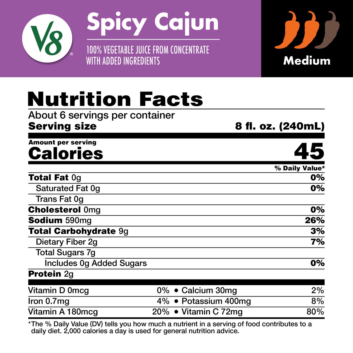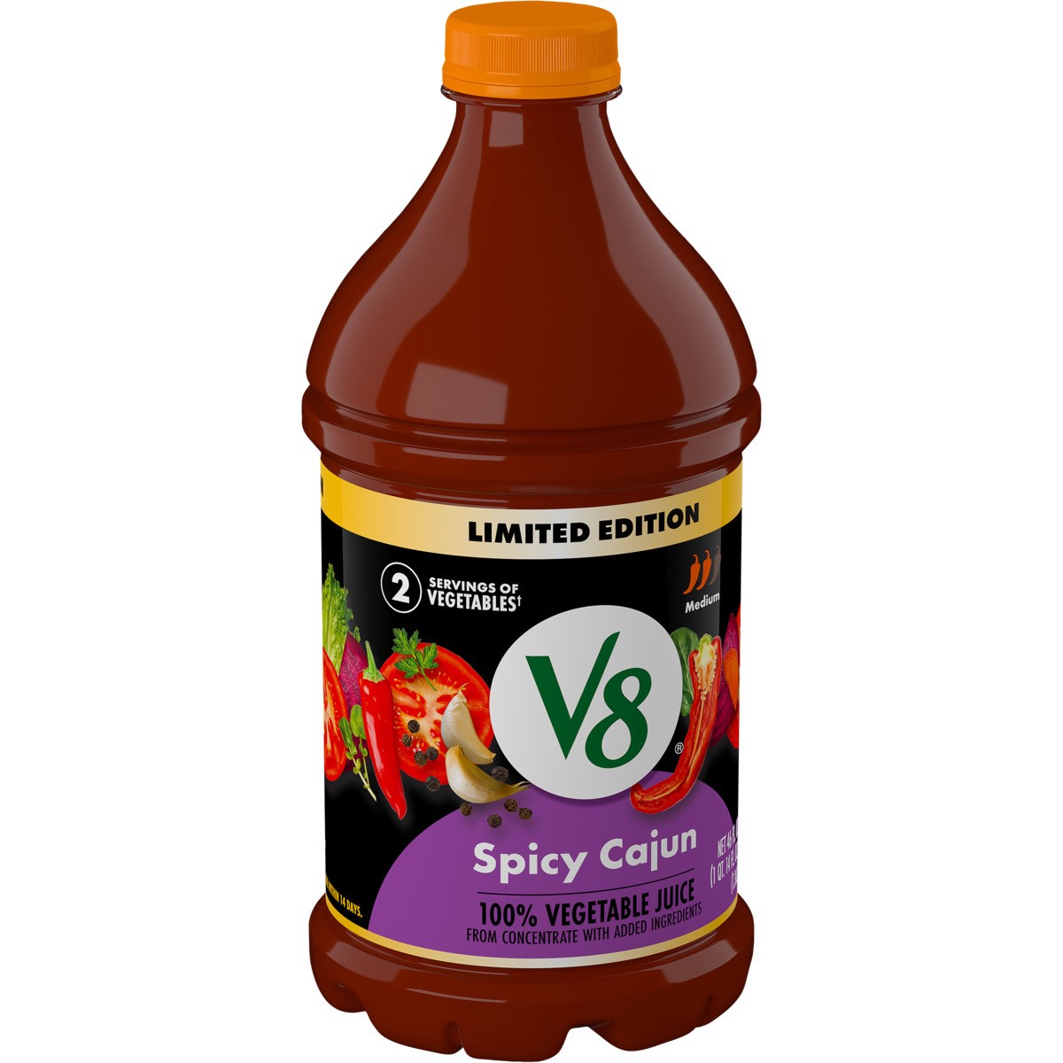 Savor the goodness of V8 Spicy Cajun 100% Vegetable Juice. This spicy V8 juice is made with concentrated tomato juice and the juices of seven other vegetables, plus chili pepper and black pepper extra…