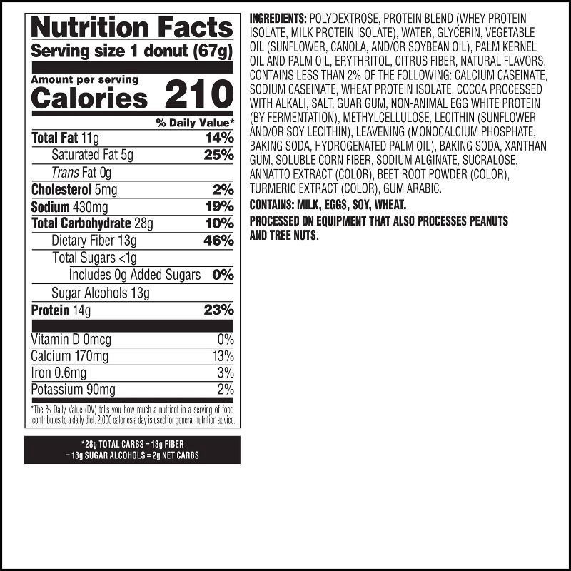 - PROTEIN FORWARD. 14g of protein, less than 1g of sugar, and 2g of net carbs per serving.* It's the deliciously sweet, easy-breezy cheat to support your fitness goals while living the chocolatey frosted, rainbow sprinkled dream. Offered in 4ct and 9ct packs of 2.36oz (67g) donuts.
