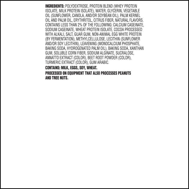 POLYDEXTROSE, PROTEIN BLEND (WHEY PROTEIN ISOLATE, MILK PROTEIN ISOLATE), WATER, GLYCERIN, VEGETABLE OIL (SUNFLOWER, CANOLA, AND/OR SOYBEAN OIL), PALM KERNEL OIL AND PALM OIL, ERYTHRITOL, CITRUS FIBER…
