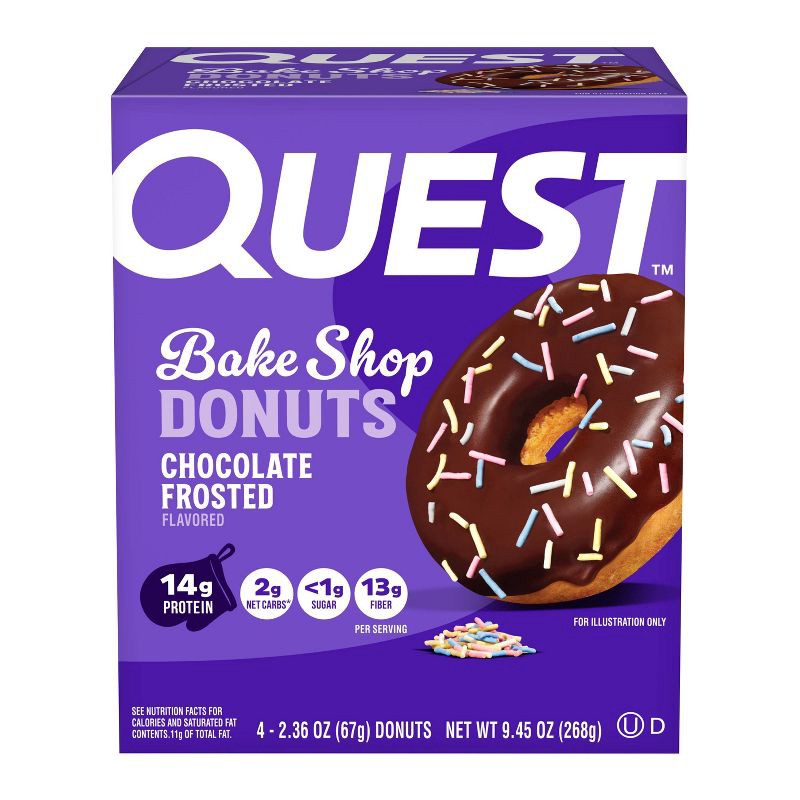 - AT HOME OR ON-THE-GO. Quest Chocolate Frosted Donuts with 14g of grab-and-go protein and 13g of fiber per serving* are just right for your morning commute, as a tasty treat at your desk, or a delicious way to refuel after a workout.