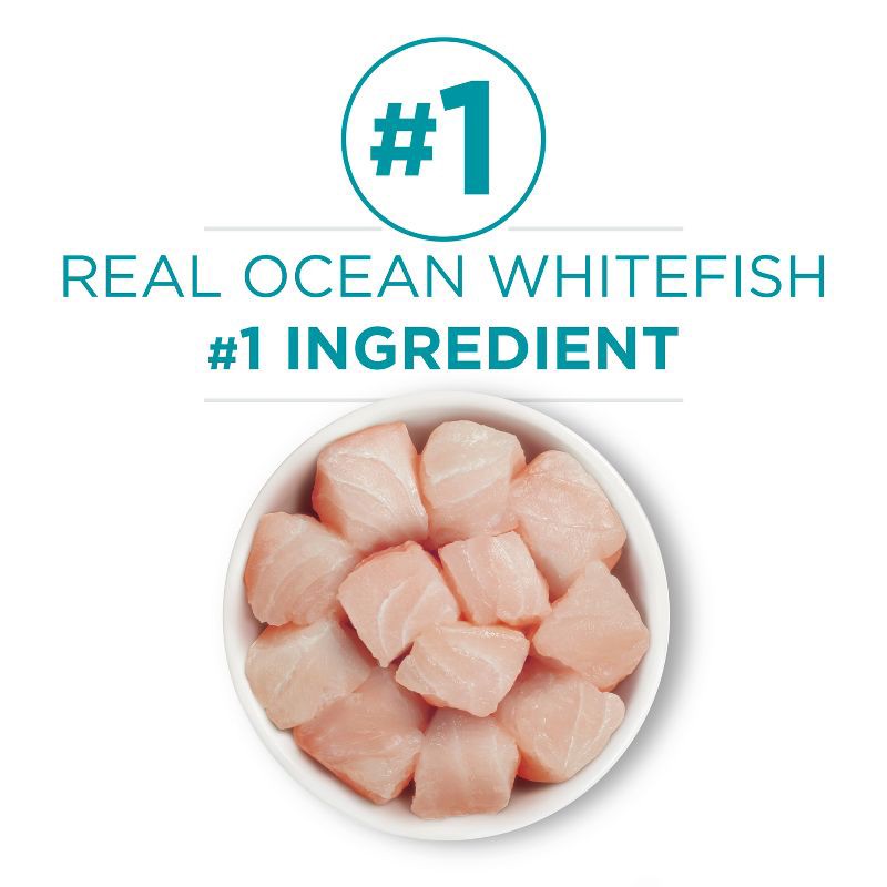 Ocean whitefish, chicken, liver, fish broth, pork lungs, fish, natural flavors, guar gum, potassium chloride, salt, VITAMINS [Vitamin E supplement, thiamine mononitrate (Vitamin B-1), niacin (Vitamin …