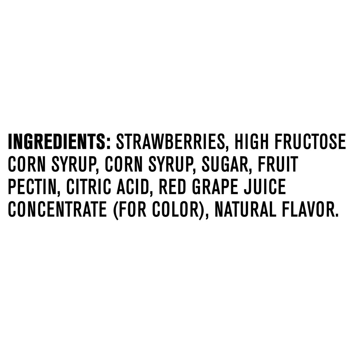 Strawberries, High Fructose Corn Syrup, Corn Syrup, Sugar, Fruit Pectin, Citric Acid, Red Grape Juice Concentrate (For Color), Natural Flavor.
