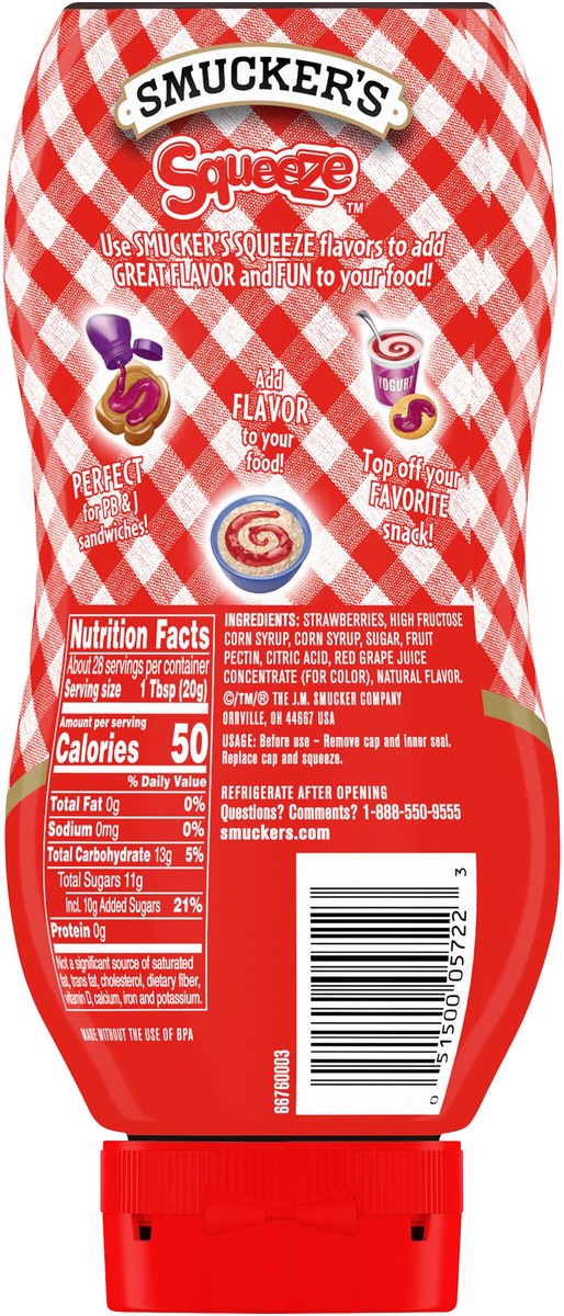 - Contains 1- 20 Ounce Bottle of Smucker's Squeeze Strawberry Fruit Spread