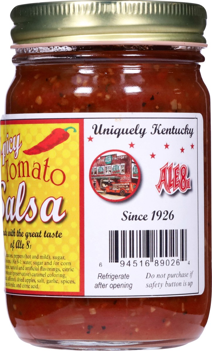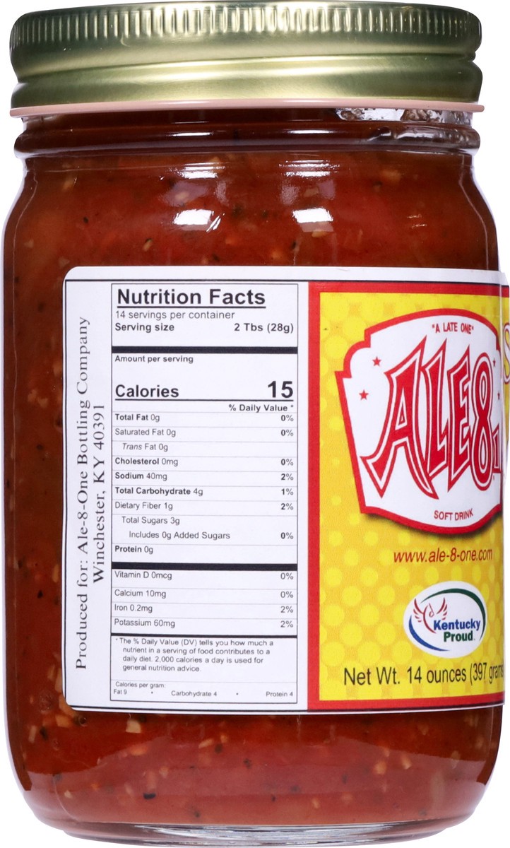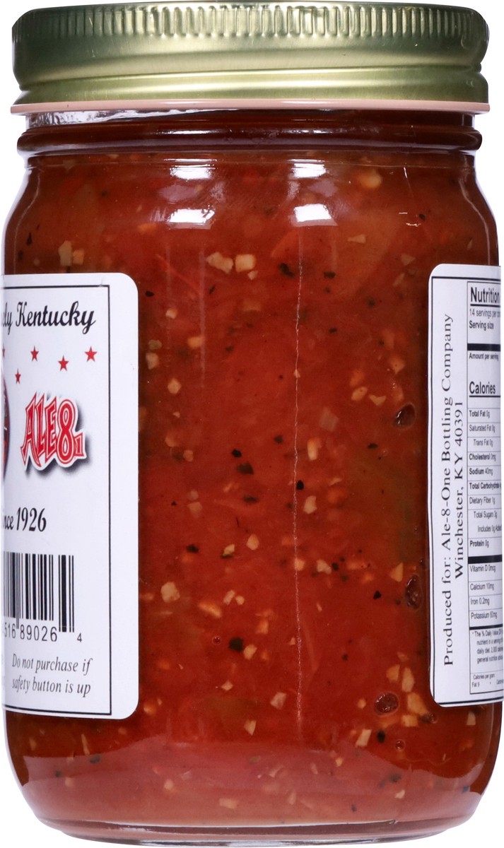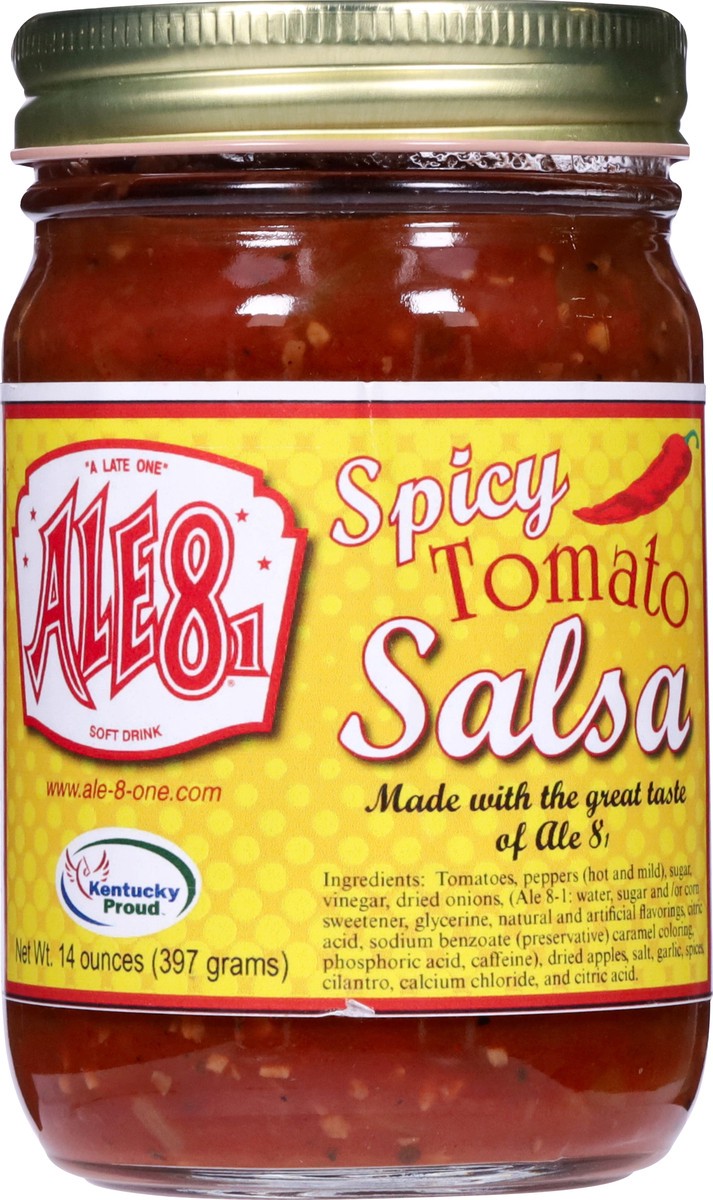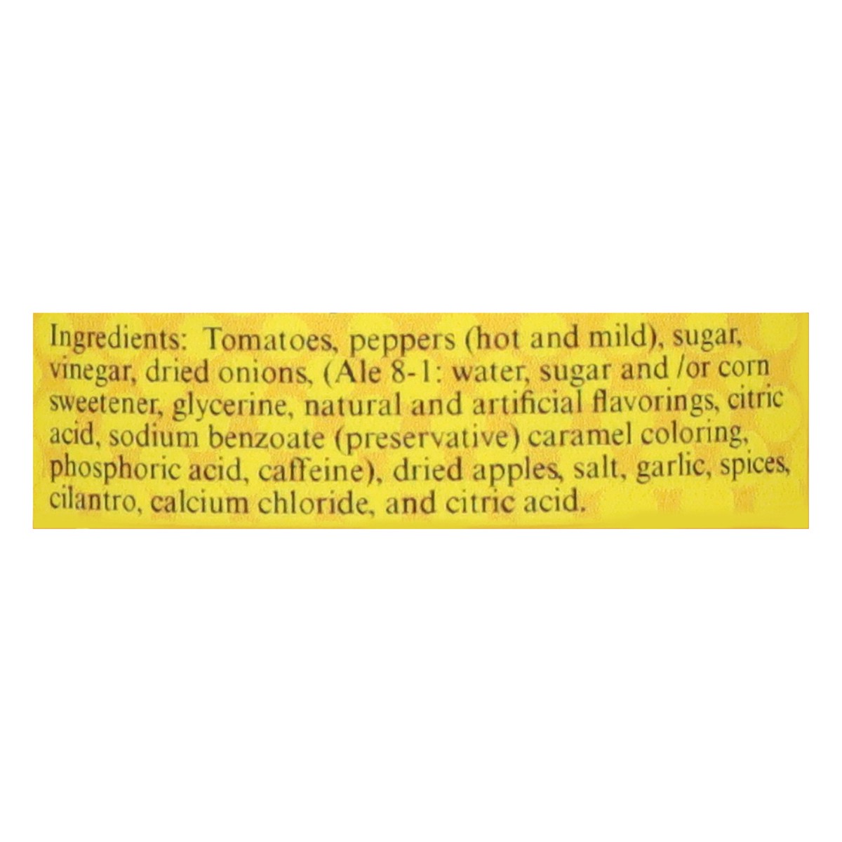Tomatoes, Peppers (Hot and Mild), Sugar, Vinegar, Dried Onions, (Ale 8-1: Water, Sugar and/or Corn Sweetener, Glycerine, Natural and Artificial Flavorings, Citric Acid, Sodium Benzoate (Preservative) …
