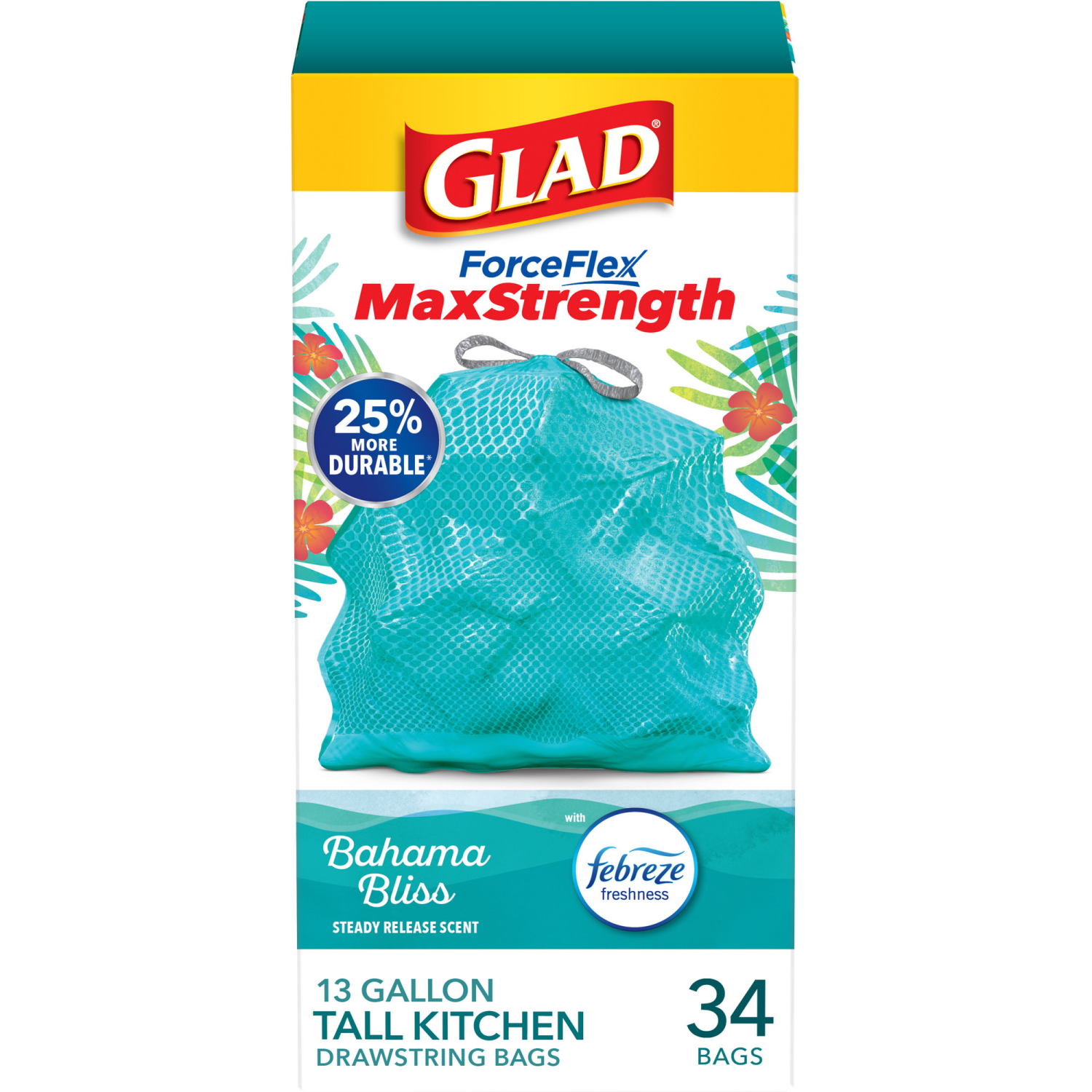 Glad ForceFlex MaxStrength Drawstring Tall Kitchen Trash Bags provide maximum strength and help you fight kitchen odors with the steady release of Bahama Bliss with Febreze freshness. Featuring double…