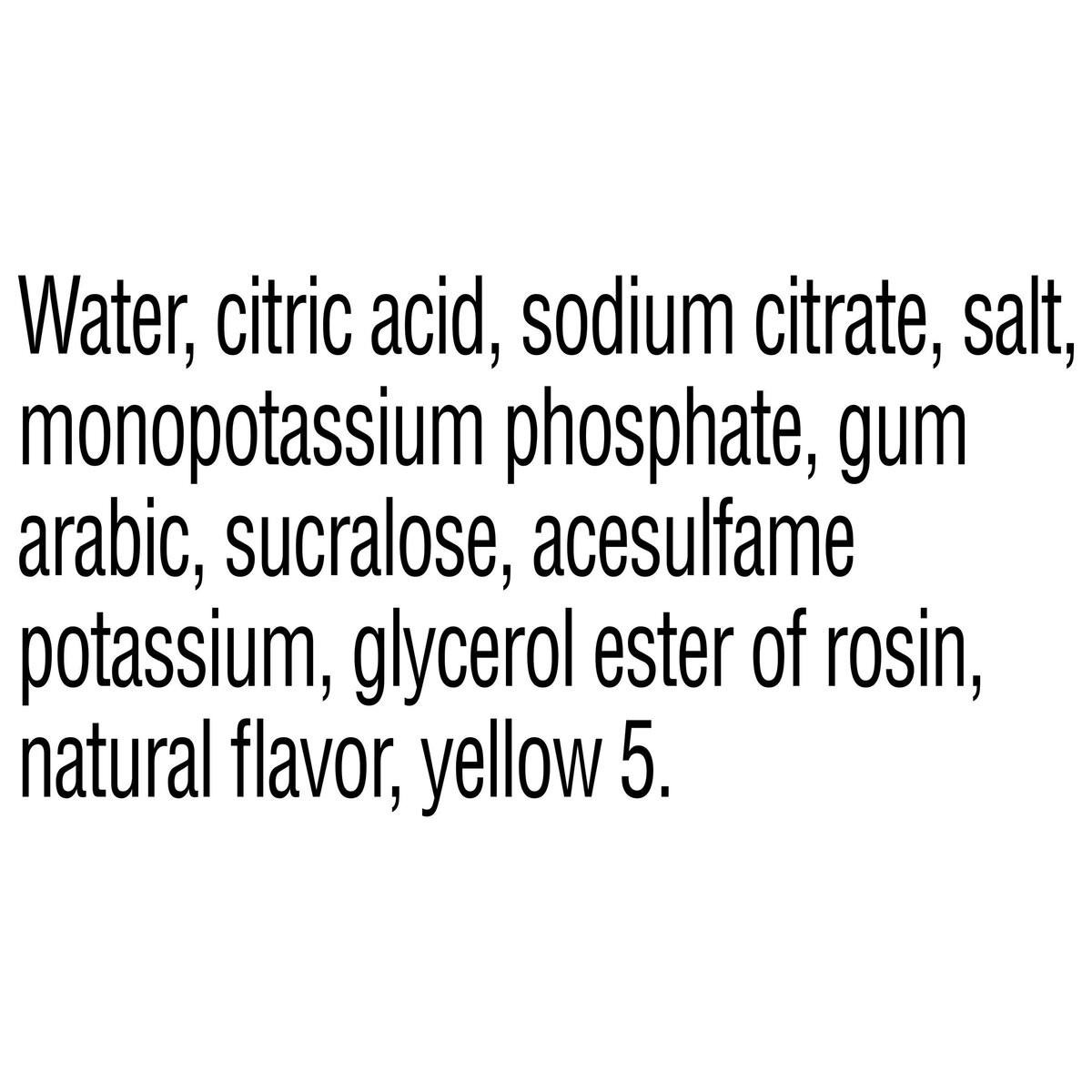 WATER, CITRIC ACID, SODIUM CITRATE, SALT, MONOPOTASSIUM PHOSPHATE, MODIFIED FOOD STARCH, NATURAL FLAVOR, SUCRALOSE, ACESULFAME POTASSIUM, GLYCEROL ESTER OF ROSIN, BLUE 1