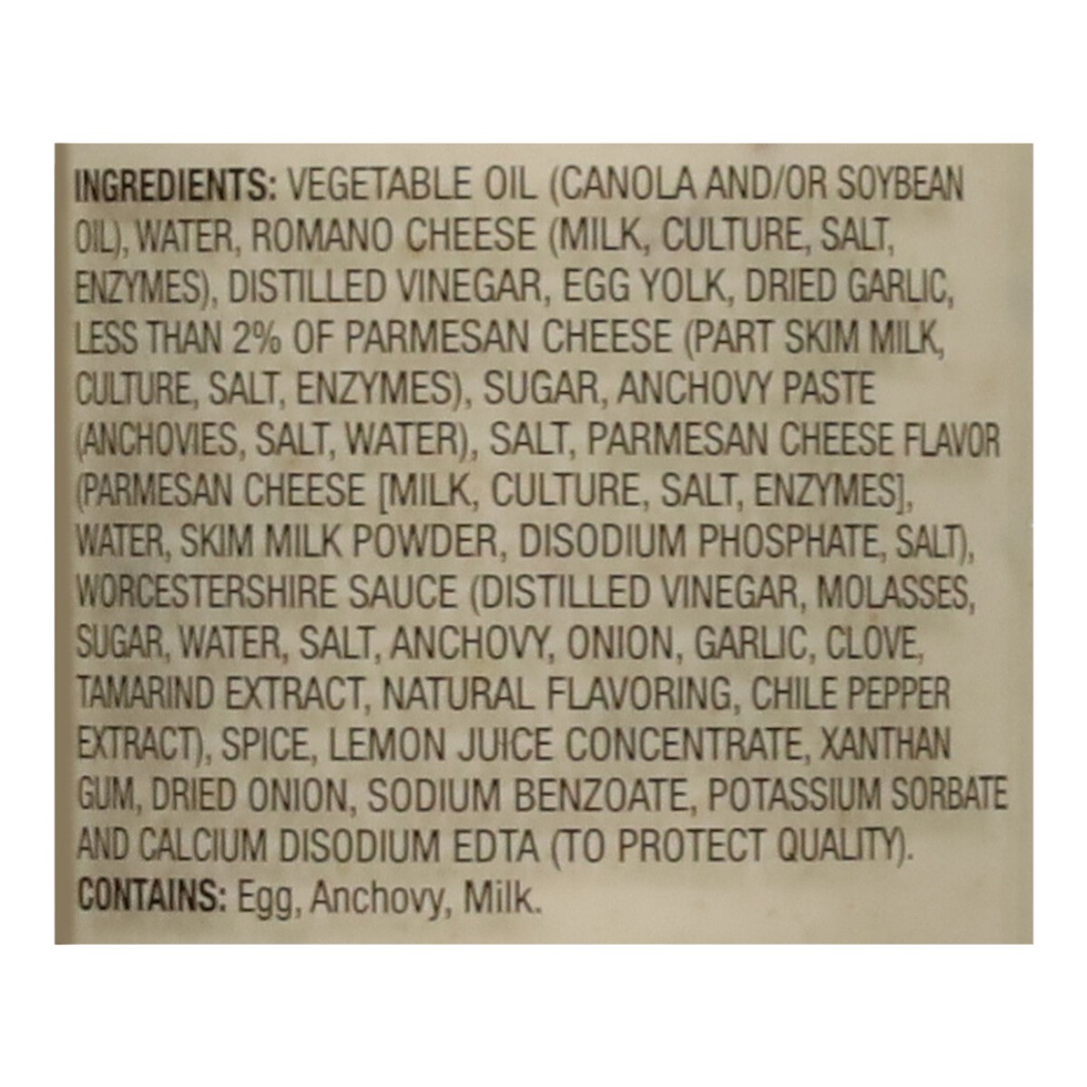Vegetable Oil (Canola and/or Soybean Oil), Water, Romano Cheese (Milk, Culture, Salt, Enzymes), Distilled Vinegar, Egg Yolk, Dried Garlic, Less than 2% of Parmesan Cheese (Part Skim Milk, Culture, Sal…