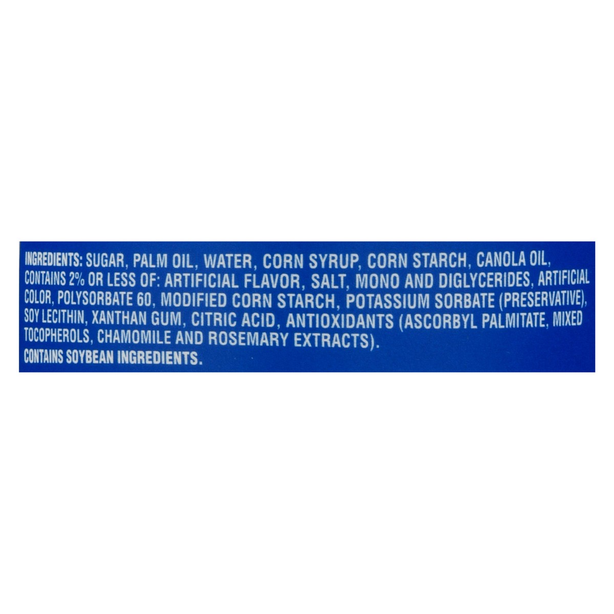 Sugar, Palm Oil, Water, Corn Syrup, Corn Starch, Canola Oil, Contains 2% or Less of: Salt, Mono- and Diglycerides, Artificial Color, Polysorbate 60, Modified Corn Starch, Potassium Sorbate (Preservati…