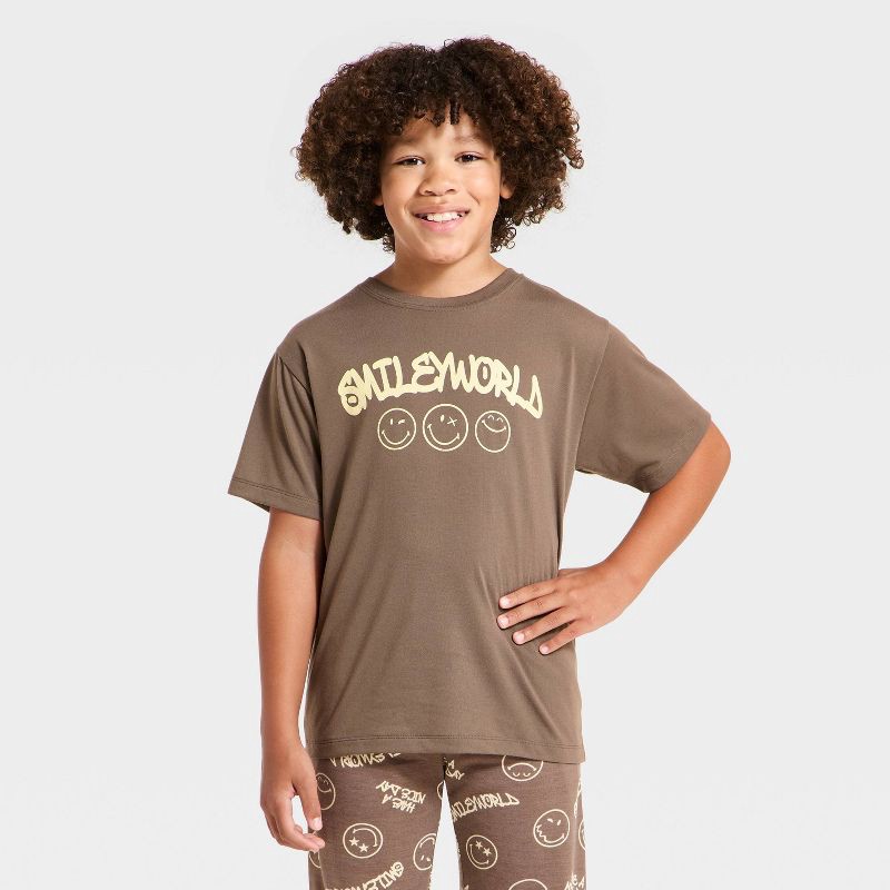 Make bedtime extra sweet with the Boys' 2pc Smiley World T-Shirt and Pant Pajama Set in Brown. This adorable two-piece set includes a short-sleeve t-shirt and matching pull-on pajama pants, perfect fo…