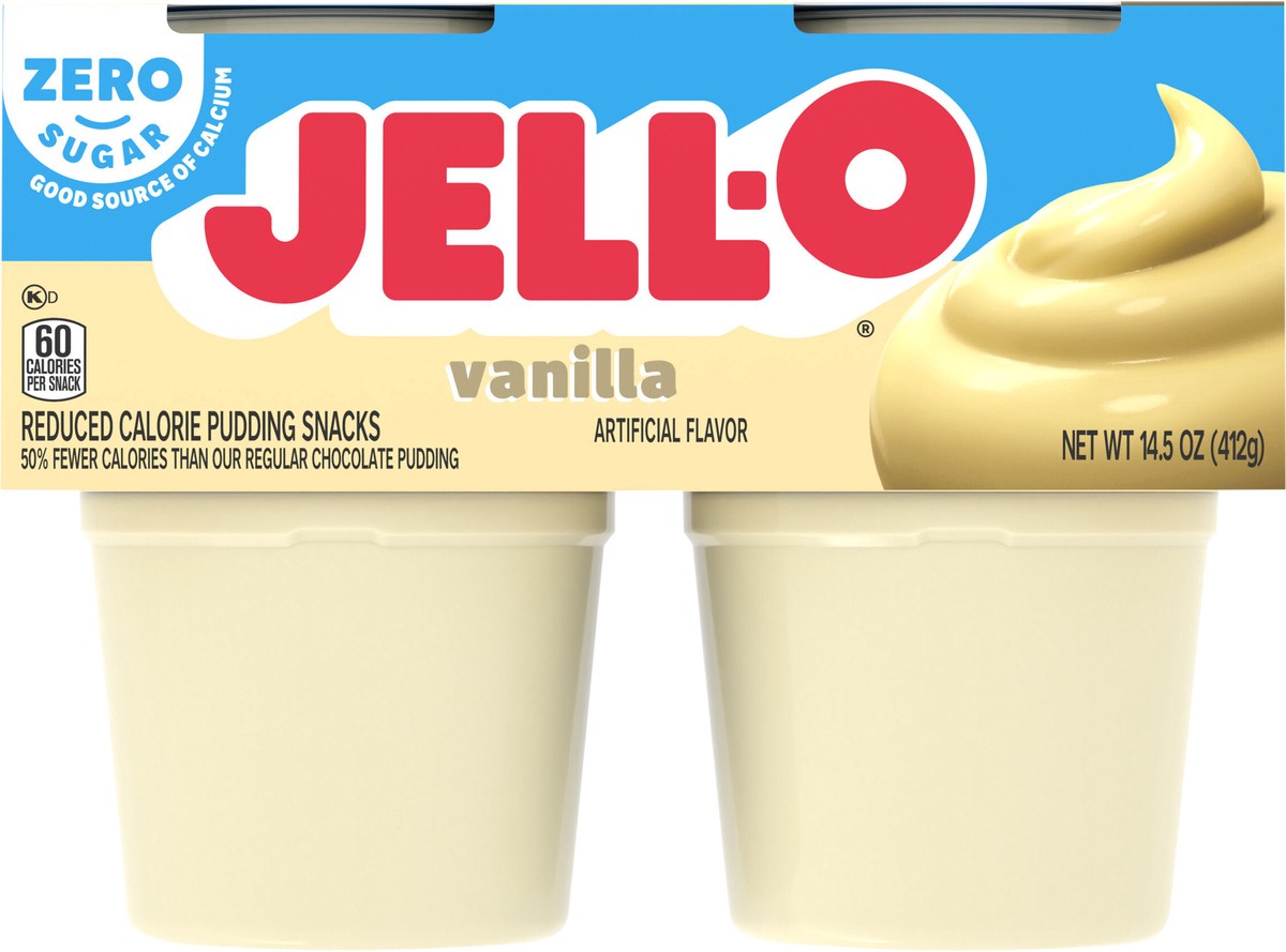 Jell-O Zero Sugar Vanilla Artificially Flavored Pudding Cups deliver the great taste of Jell-O Pudding in a reduced-calorie choice. Our delicious on-the-go pudding comes in individual snack cups, perf…