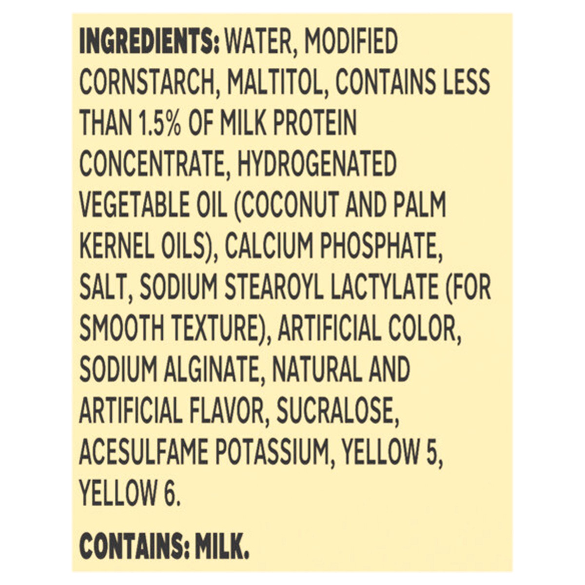WATER, MODIFIED CORNSTARCH, MALTITOL, CONTAINS LESS THAN 1.5% OF MILK PROTEIN CONCENTRATE, HYDROGENATED VEGETABLE OIL (COCONUT AND PALM KERNEL OILS), CALCIUM PHOSPHATE, SALT, SODIUM STEAROYL LACTYLATE…