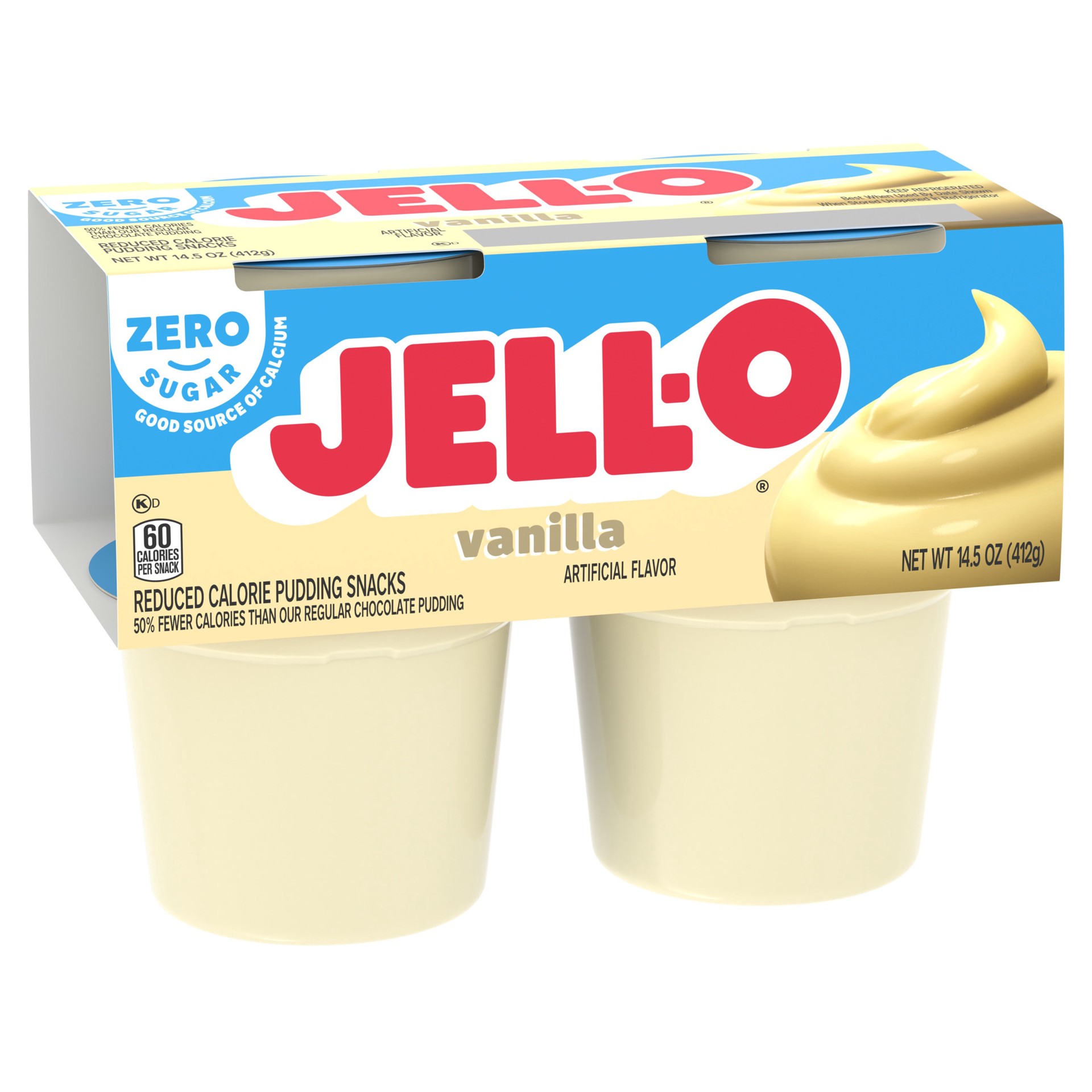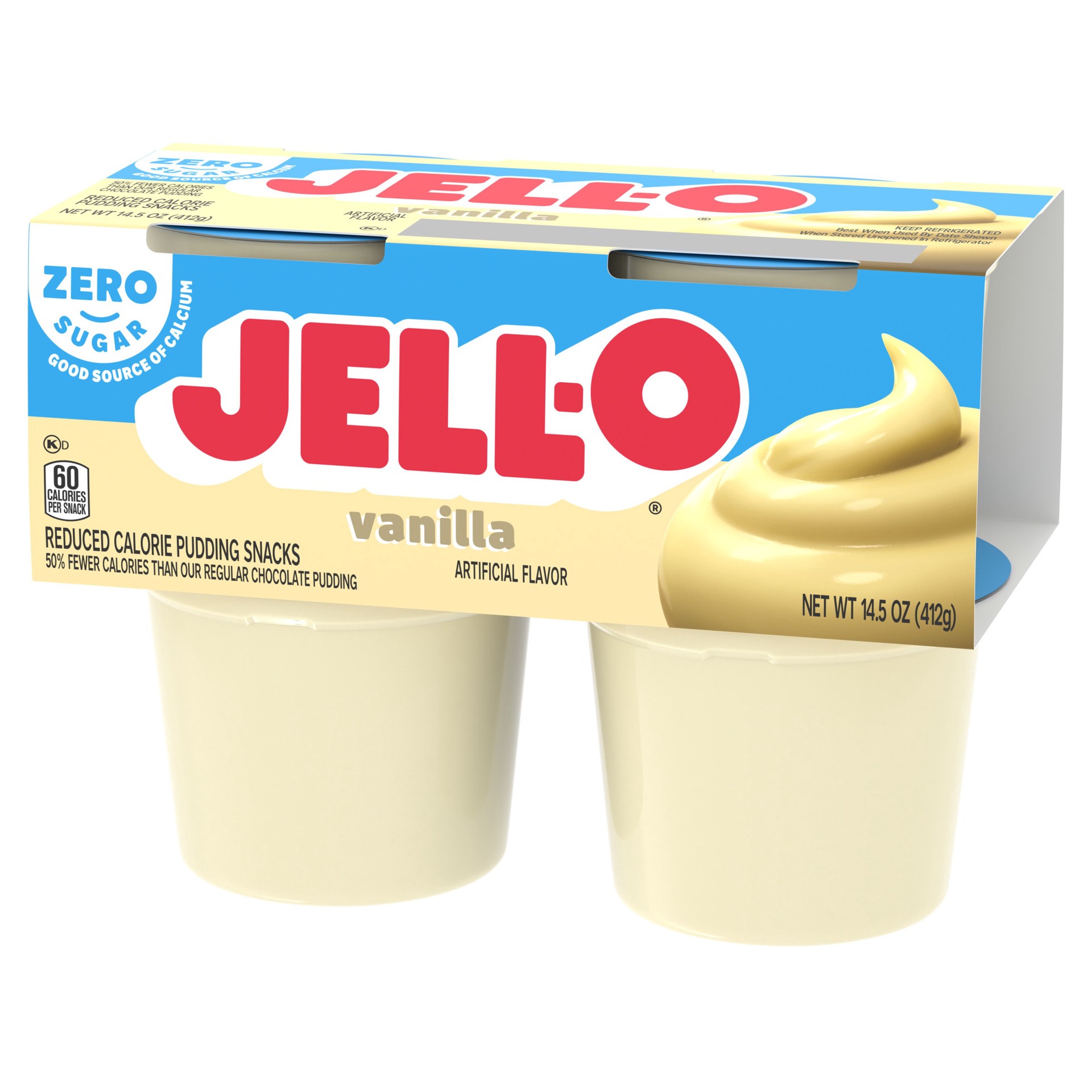 Jell-O Zero Sugar Vanilla Artificially Flavored Pudding Cups deliver the great taste of Jell-O Pudding in a reduced-calorie choice. Our delicious on-the-go pudding comes in individual snack cups, perf…