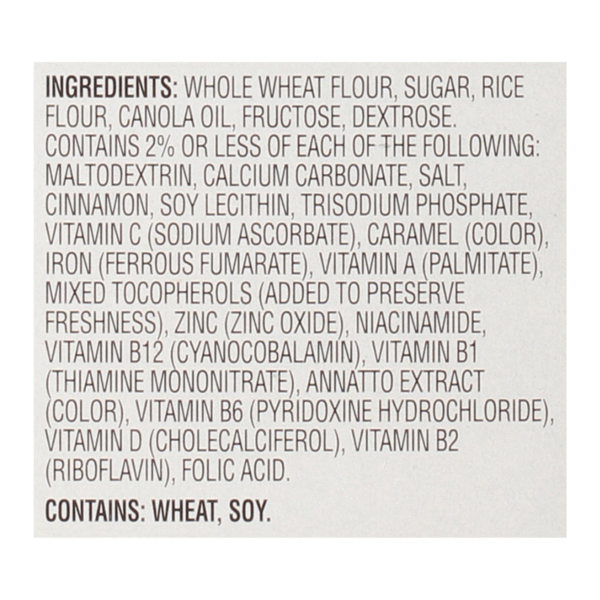 Whole Wheat Flour, Sugar, Rice Flour, Canola Oil, Fructose, Dextrose, Contains 2% or Less of Each of the Following: Maltodextrin, Calcium Carbonate, Salt, Cinnamon, Soy Lecithin, Trisodium Phosphate, …