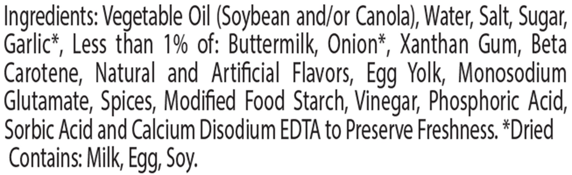 Vegetable Oil (Soybean and/or Canola), Water, Salt, Sugar, Garlic*, Less than 1% of: Buttermilk, Onion*, Xanthan Gum, Beta Carotene, Natural and Artificial Flavors, Egg Yolk, Monosodium Glutamate, Spi…