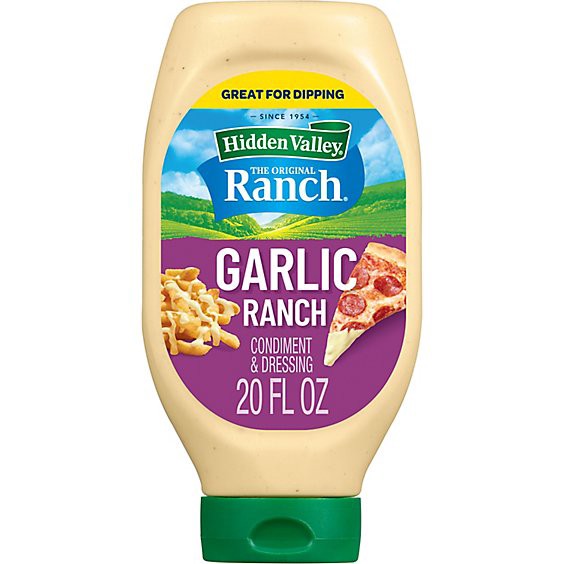 Get two of your favorite flavors in one when you reach for the creamy, garlicky taste of Hidden Valley Garlic Ranch Dressing. Made with real garlic, this thick and creamy dressing has zesty, bold flav…