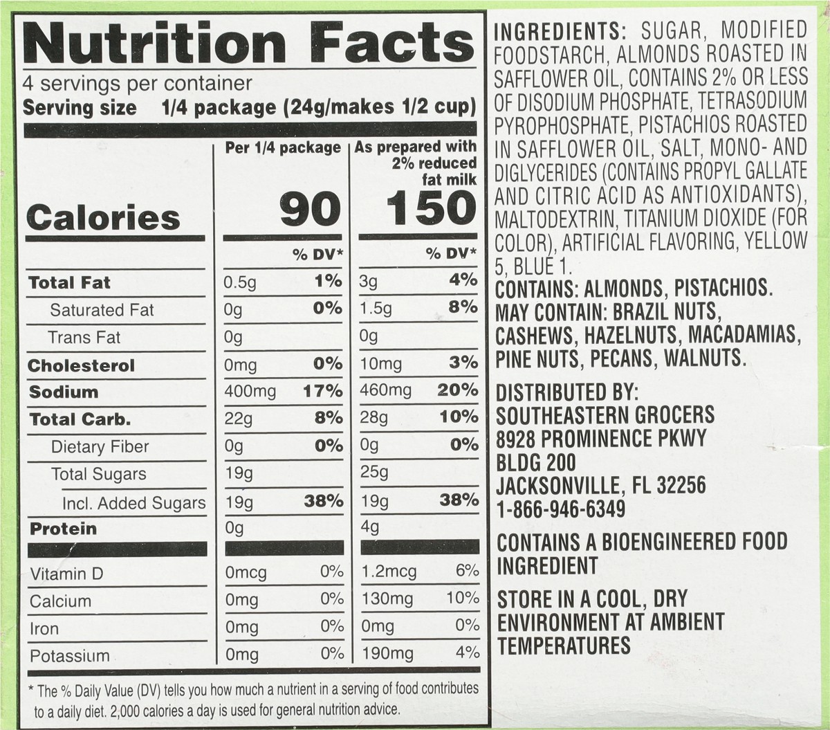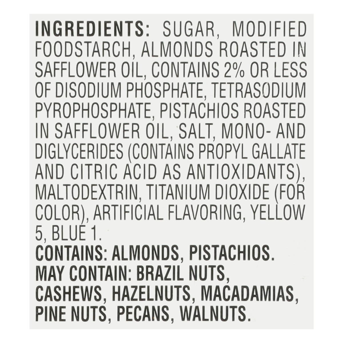 Sugar, Modified Foodstarch, Almonds Roasted in Safflower Oil, Contains 2% or Less of Disodium Phosphate, Tetrasodium Pyrophosphate, Pistachios Roasted in Safflower Oil, Salt, Mono- and Diglycerides (C…