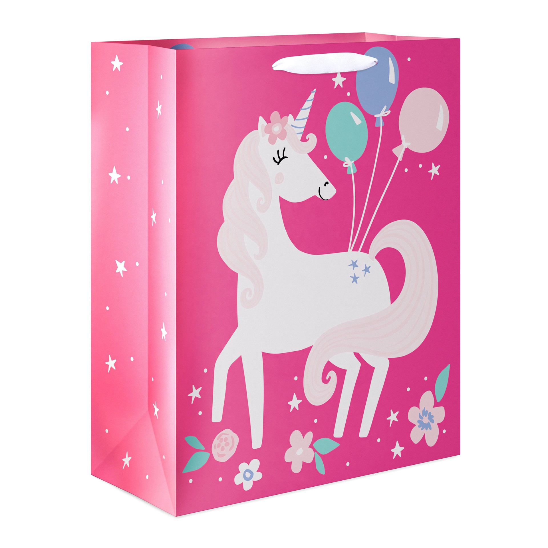 Give the perfect gift in this adorable Extra Large gift bag. It features a cute unicorn and flowers on a bright pink background with pink, blue, and green balloons and satin ribbon handles. Extra Larg…