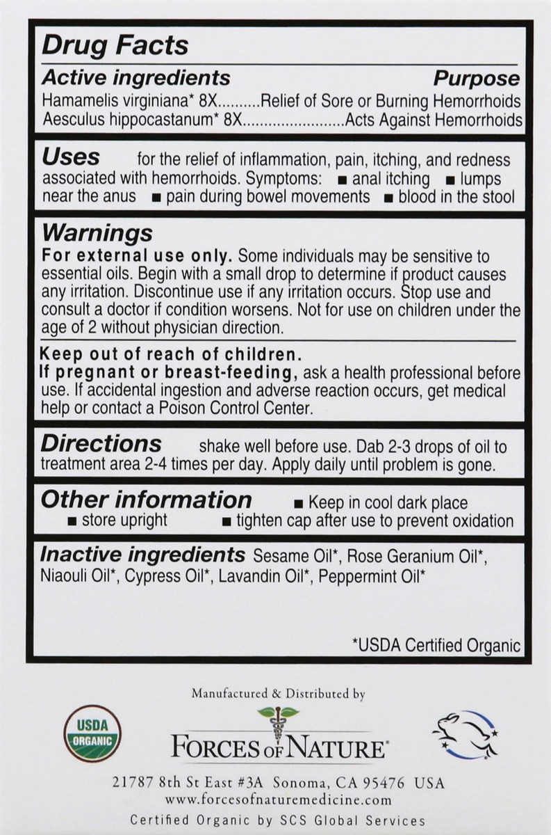 Active Ingredients: Hamamelis Virginiana 8X, Aesculus Hippocastanum 8X. Purpose: Relief of Hemorrhoids That Are Sore or Burning, Acts Against Hemorrhoids. Inactive Ingredients: Sesame Oil (USDA Certif…