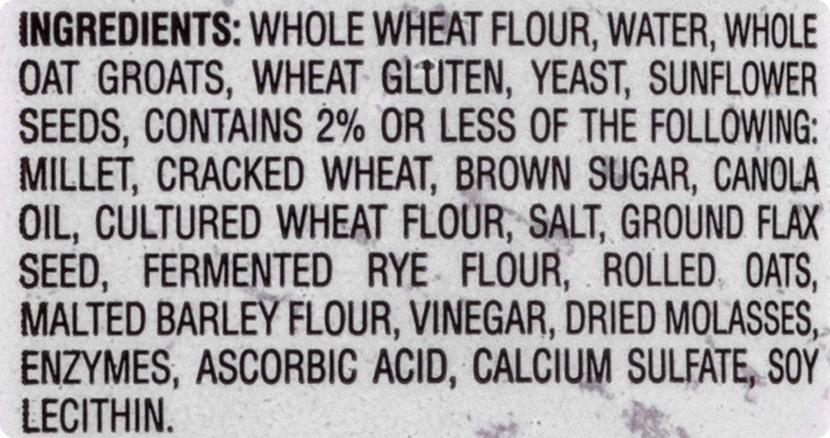 Whole Wheat Flour, Water, Whole Oat Groats, Wheat Gluten, Yeast, Sunflower Seeds, Contains 2% or Less of the Following: Millet, Cracked Wheat, Brown Sugar, Canola Oil, Cultured Wheat Flour, Salt, Grou…
