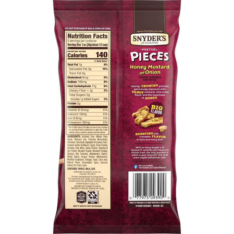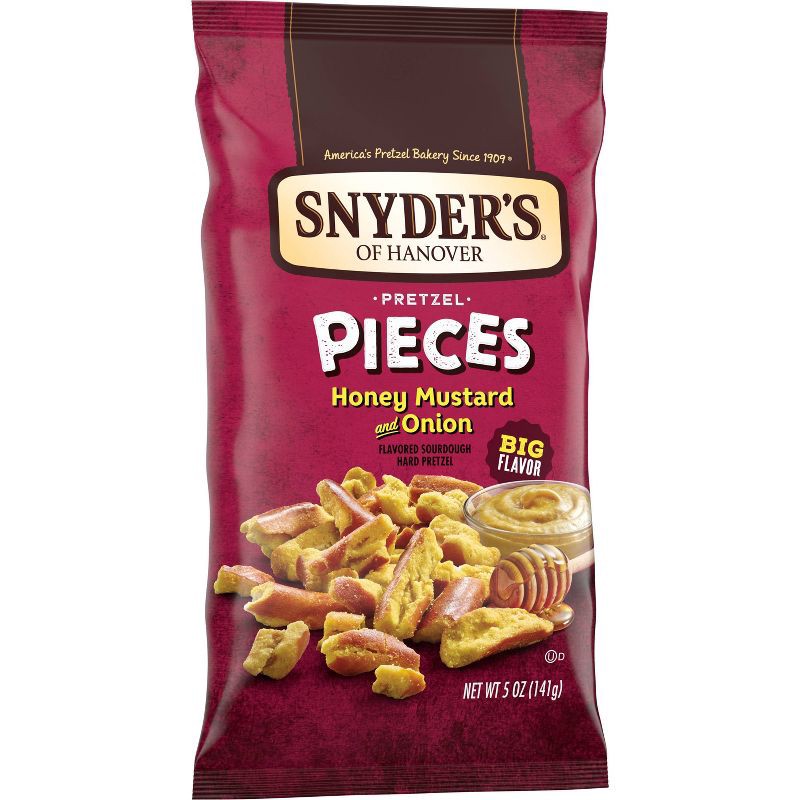 - Includes one (1) 5-ounce bag of Snyder's of Hanover Honey Mustard & Onion Flavored Pretzel Pieces