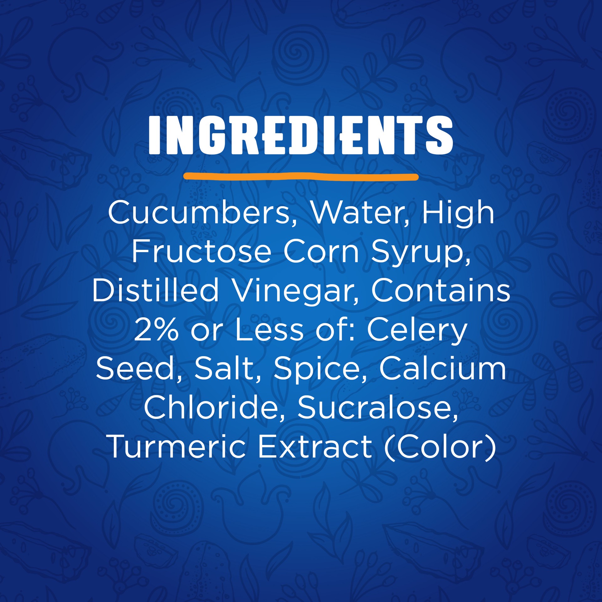 Cucumbers, Water, High Fructose Corn Syrup, Distilled Vinegar, Less than 2%: Salt, Spice, Calcium Chloride, Polysorbate 80, Sucralose, Turmeric Extract (Color).