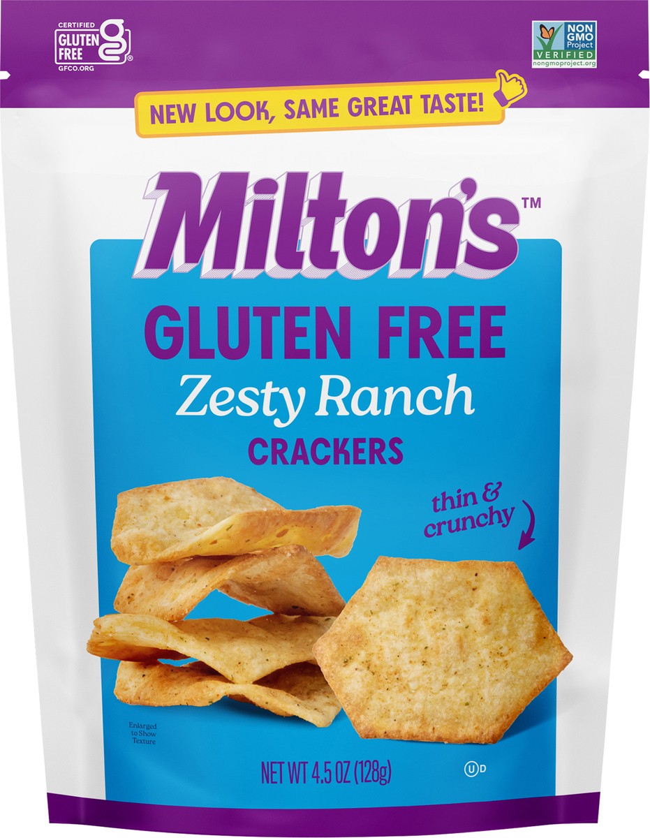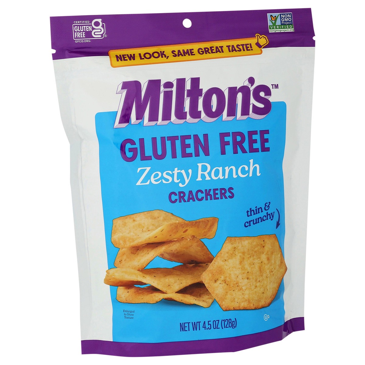 Made with a flavorful combination of five gluten free grains, and baked to crispy perfection with just the right touch of sea salt, Milton’s Gluten Free Zesty Ranch Baked Crackers are the perfect acco…