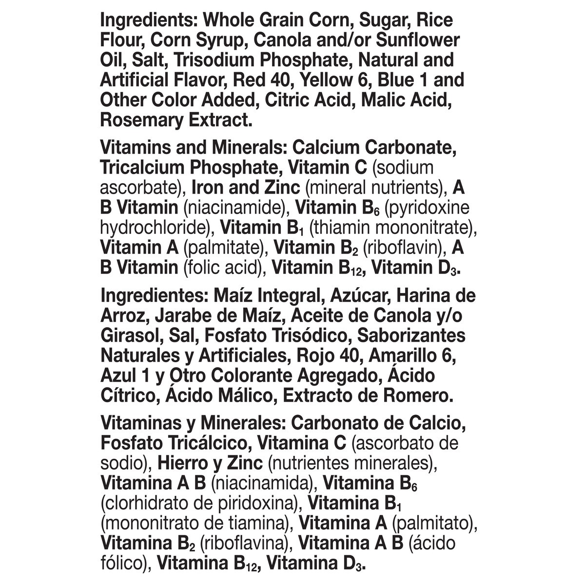 Whole Grain Corn, Sugar, Rice Flour, Corn Syrup, Canola and/or Sunflower Oil, Salt, Trisodium Phosphate, Natural and Artificial Flavor, Red 40, Yellow 6, Blue 1 and Other Color Added, Citric Acid, Mal…