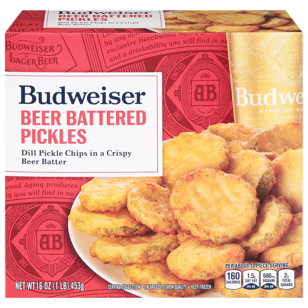 Pickles (Cucumbers, Water, Vinegar, Salt, Calcium Chloride, Lactic Acid, Natural Flavor, to Preserve Freshness [Sodium Benzoate], Turmeric, Polysorbate 80), Budweiser Lager Beer (Water, Barley Malt, R…