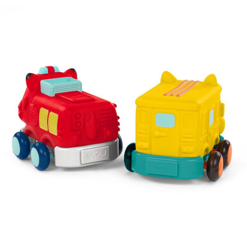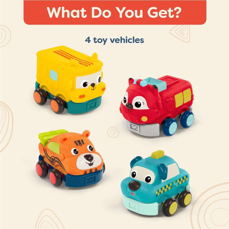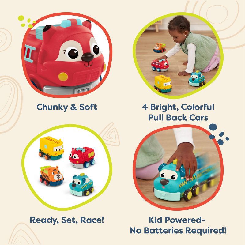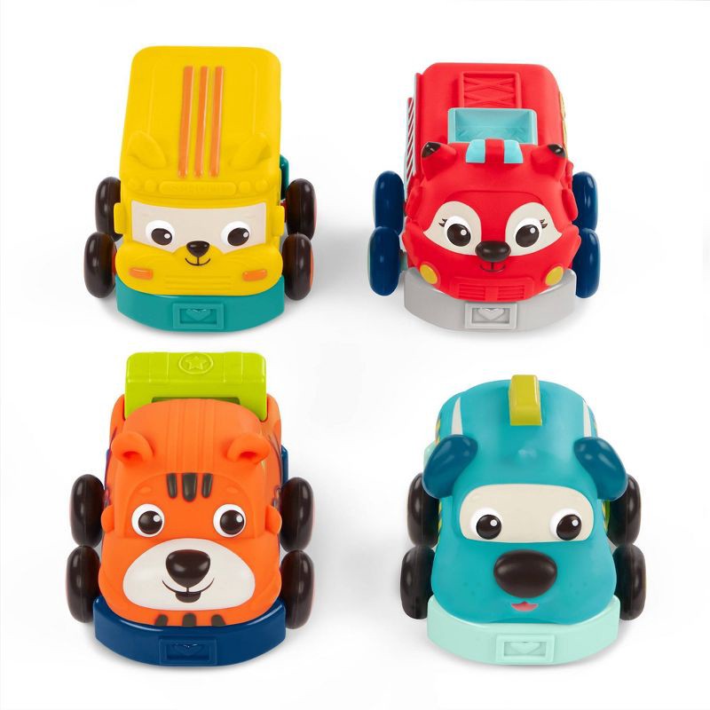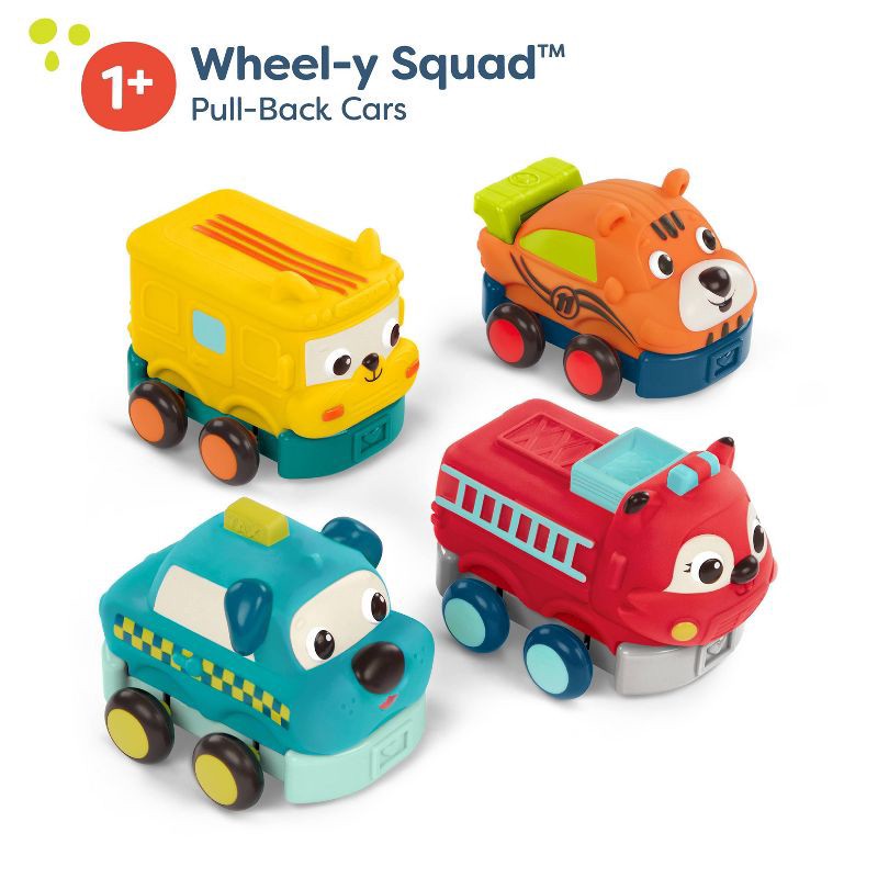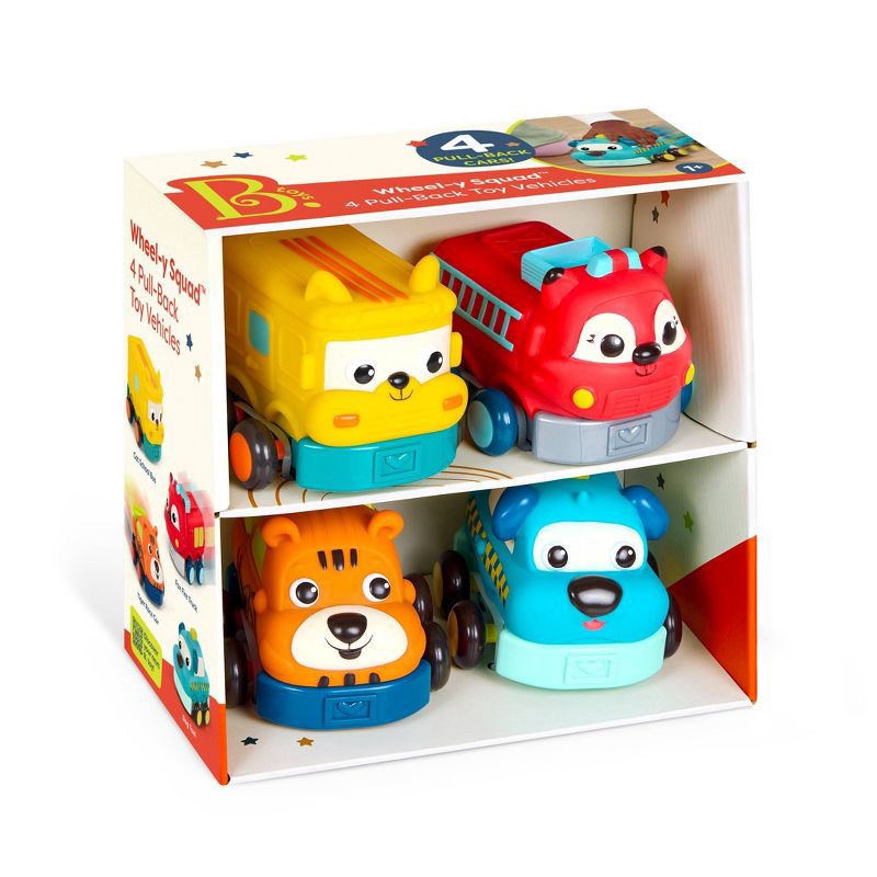 Roll into playtime alongside a gaggle of animal pals with Wheel-y Squad from B. toys! These smiley pull-back toy cars come in a pack of four that includes a race car, school bus, fire truck, and taxi.…