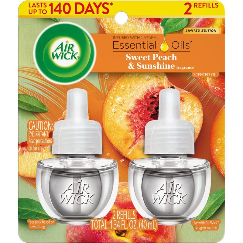 - LONG-LASTING VALUE: Enjoy up to 70 days of continuous fragrance per refill on the low setting—ideal for maintaining a consistently fresh smelling home with minimal effort.FRAGRANCE: A sun-filled fruity blend of sweet peach with zesty citrus accents and hints of sun-kissed musk create a fun, fruity experience. NATURAL ESSENTIAL OILS: Each refill is infused with natural essential oils for an incredible fragrance experienceCUSTOMIZABLE FRAGRANCE CONTROL: Choose from 5 adjustable settings to personalize your scent strength. Refills are compatible with all current versions of Air Wick plug-inUSE IN MULTIPLE ROOMS: Perfect for living rooms, bathrooms, kitchens, offices, and more! Simply plug in to transform your room into an inviting and fragrant space.