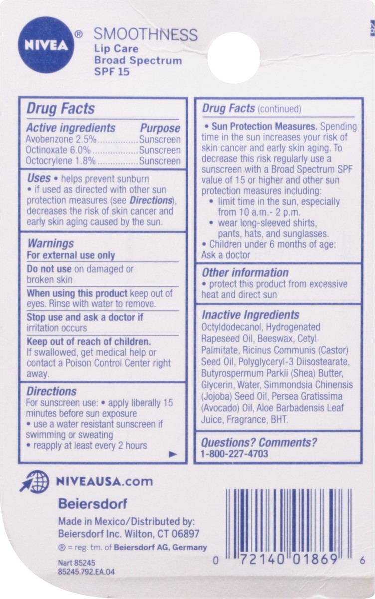 NIVEA Smoothness Lip Care, Broad Spectrum SPF 15 Lip Balm helps to protect lips from sunburn. This NIVEA Smoothness moisturizing lip balm formula with SPF 15 is Mineral Oil free and enriched with a va…