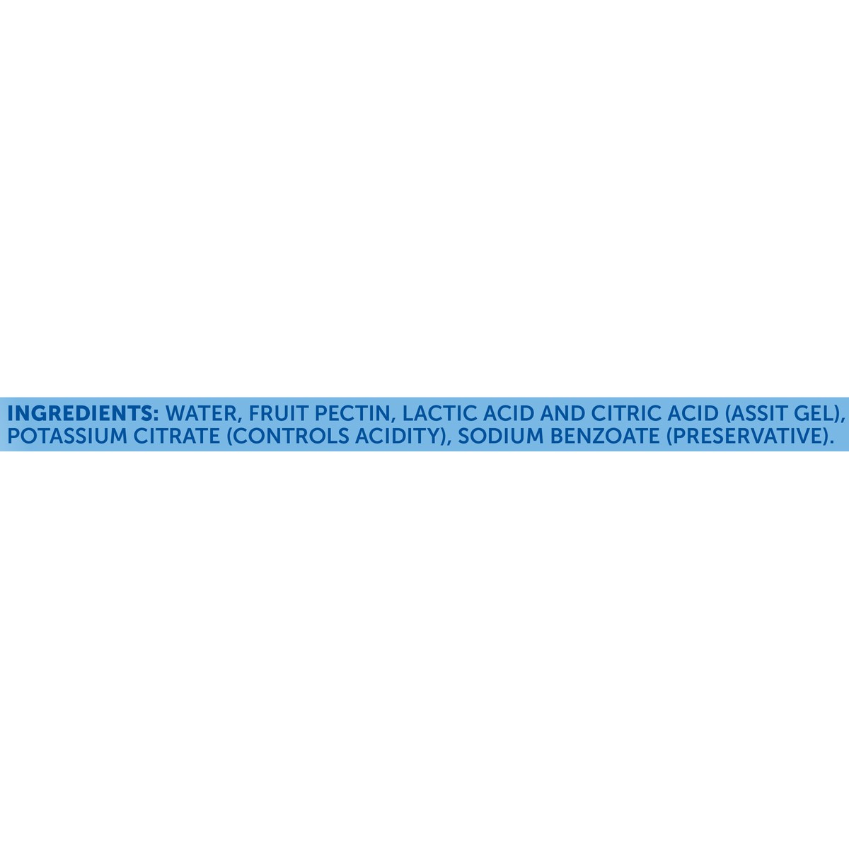 WATER, FRUIT PECTIN, LACTIC ACID AND CITRIC ACID (ASSIT GEL), POTASSIUM CITRATE (CONTROLS ACIDITY), SODIUM BENZOATE (PRESERVATIVE).