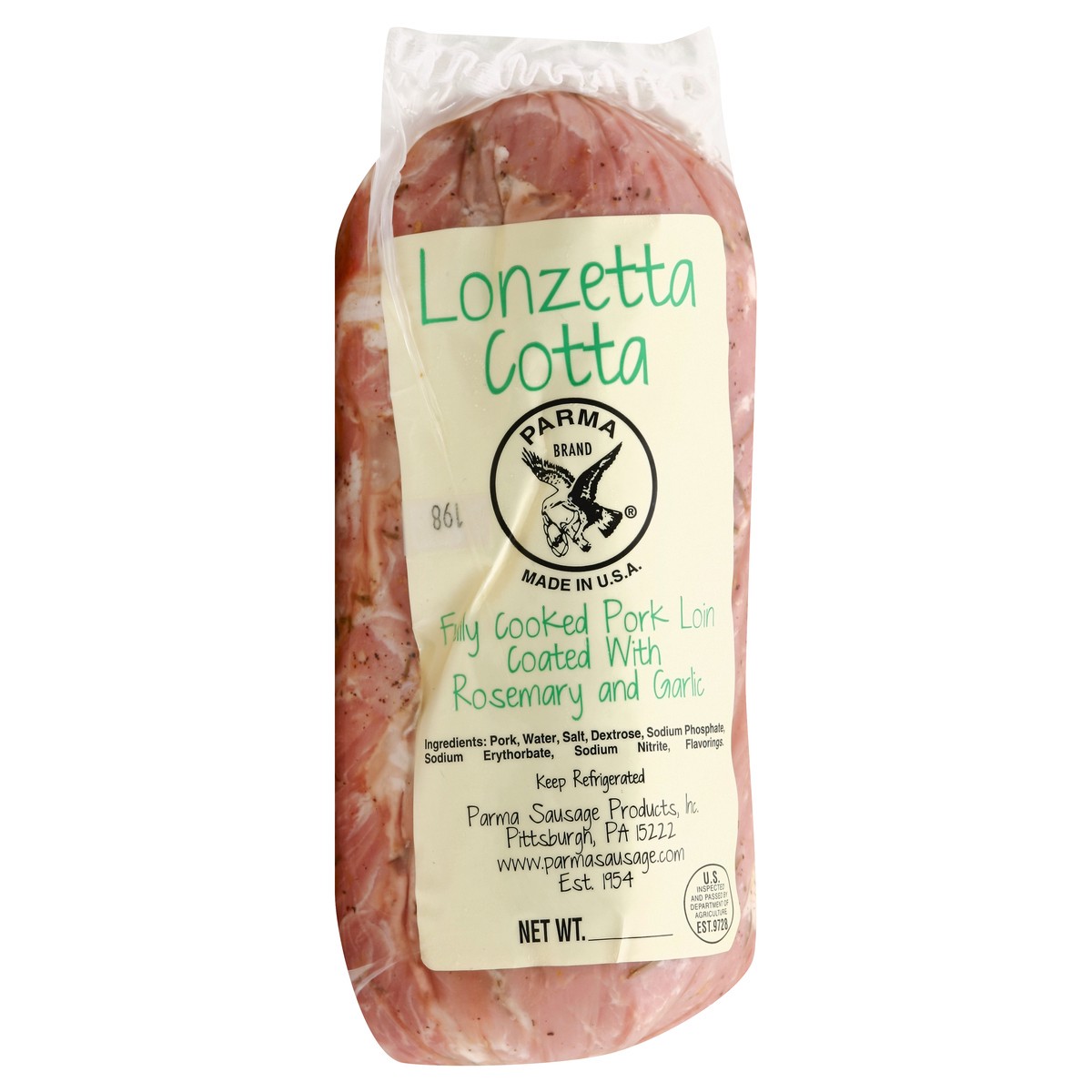 Fully cooked pork loin coated with rosemary and garlic. www.parmasausage.com. Est 1954. US inspected and passed by Department of Agriculture. Made in USA.