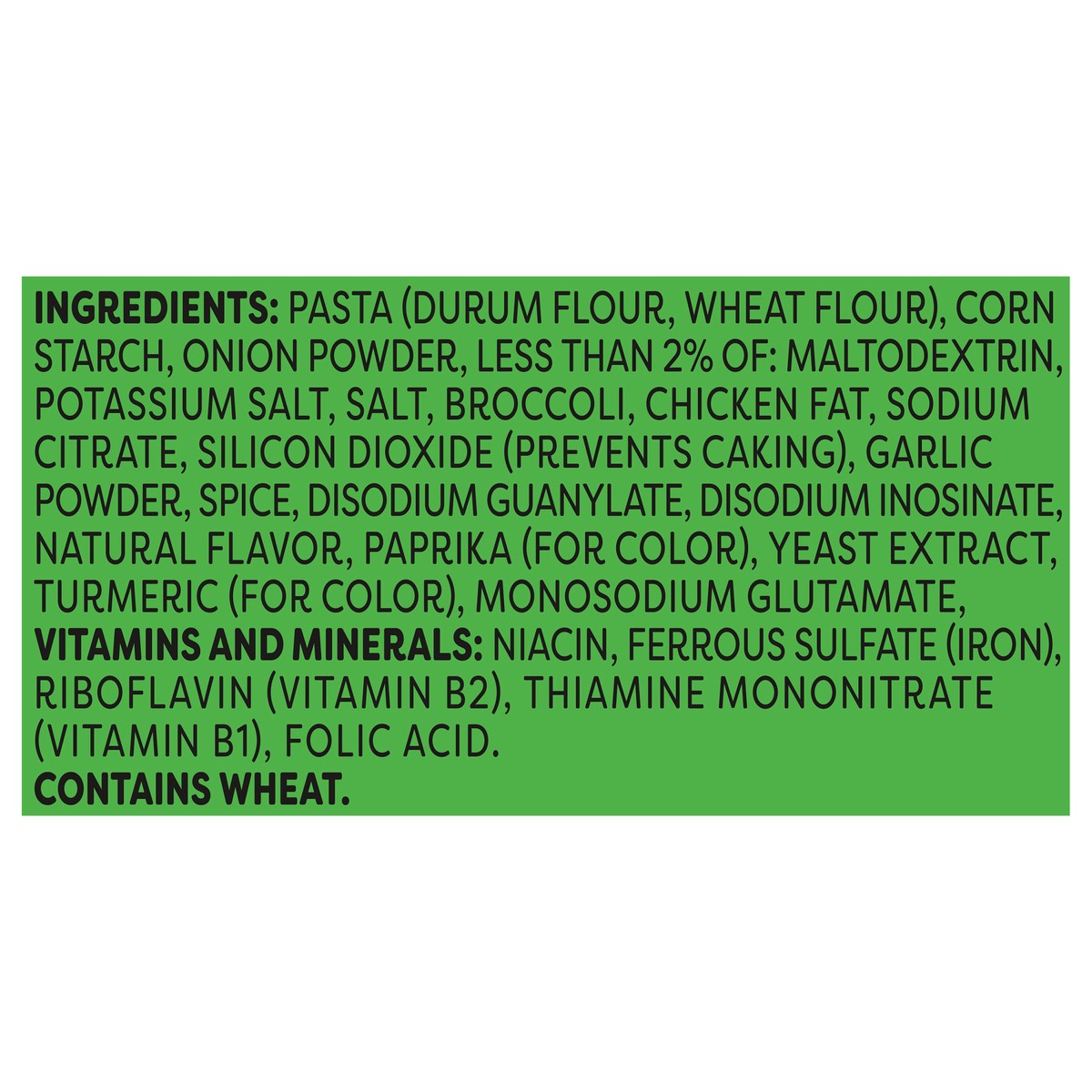 Pasta (Durum Flour, Wheat Flour), Corn Starch, Onion Powder, Less Than 2% Of: Maltodextrin, Potassium Salt, Salt, Broccoli, Chicken Fat, Sodium Citrate, Silicon Dioxide (Prevents Caking), Garlic Powde…