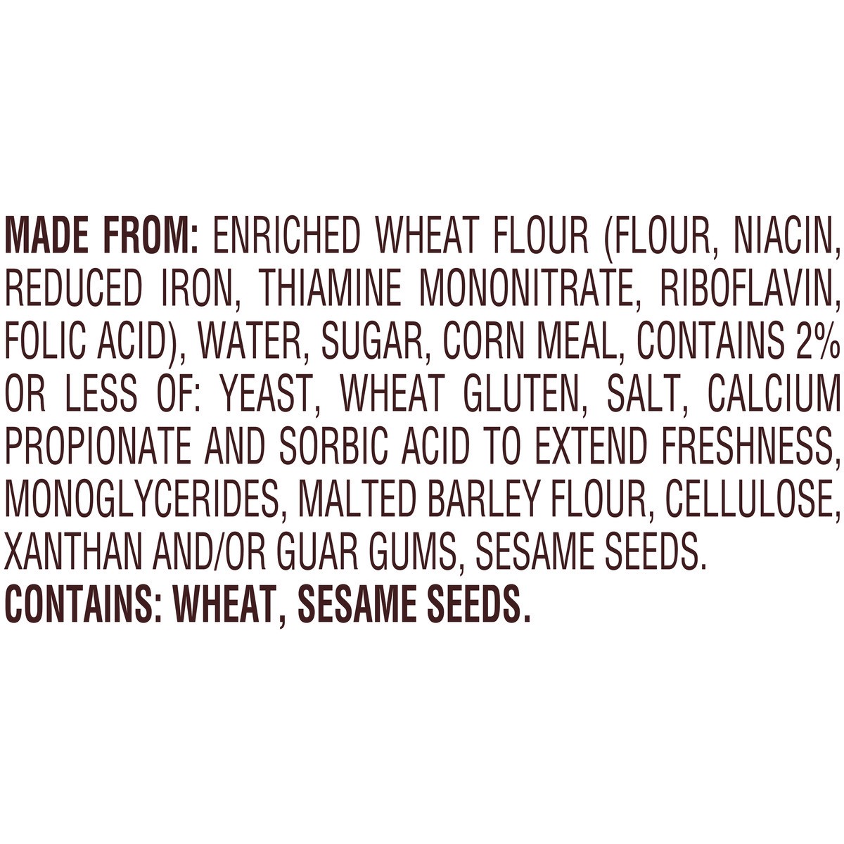 MADE FROM: ENRICHED WHEAT FLOUR (FLOUR, NIACIN, REDUCED IRON, THIAMINE MONONITRATE, RIBOFLAVIN, FOLIC ACID), WATER, SUGAR, CORN MEAL, CONTAINS 2% OR LESS OF: YEAST, WHEAT GLUTEN, SALT, CALCIUM PROPION…
