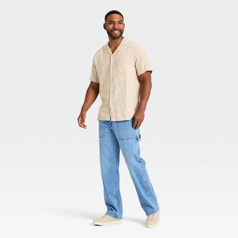 Dress up for evening strolls or weekend outings in this Short-Sleeve Camp Shirt from Goodfellow & Co™. Made from a fabric blend of linen, cotton, and recycled polyester, this crepe shirt offers breezy…