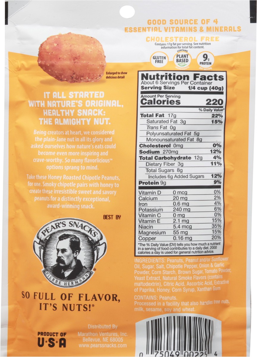 Peanuts, Peanut and/or Sunflower Oil, Sugar, Salt, Chipotle Pepper, Onion & Garlic Powder, Corn Starch, Brown Sugar, Tomato Powder, Yeast Extract, Natural Smoke Flavors (Contains Maltodextrin), Citric…