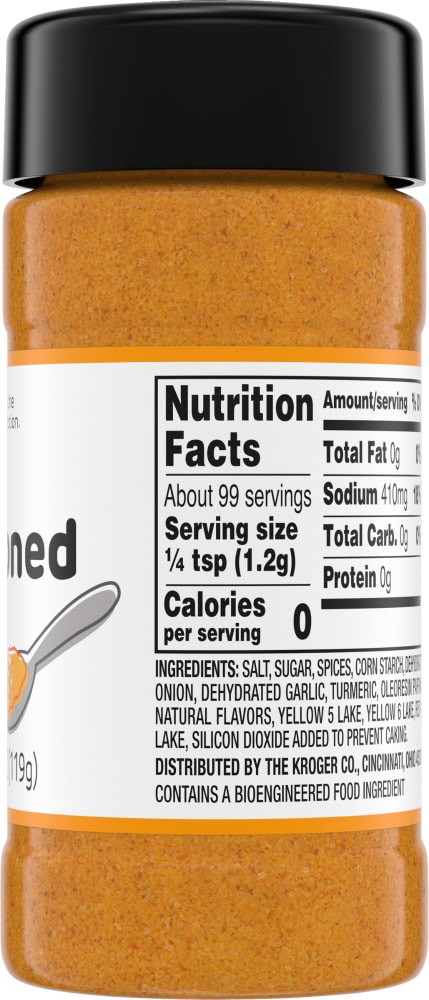 Salt, Sugar, Spices, Corn Starch, Dehydrated Onion, Dehydrated Garlic, Turmeric, Oleoresinpaprika, Natural Flavors, Yellow Lake #5, Yellow Lake#6, Red Lake #40, And Silicon Dioxideadded To Prevent Cak…